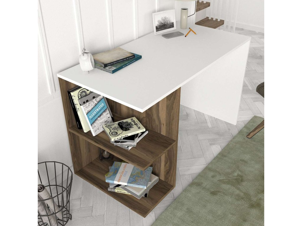 Stůl DIMAS v bílé a ořechové barvě je ideální do kanceláře nebo dětského pokoje. Nabízí dostatek místa a úložného prostoru díky integrovanému regálku.