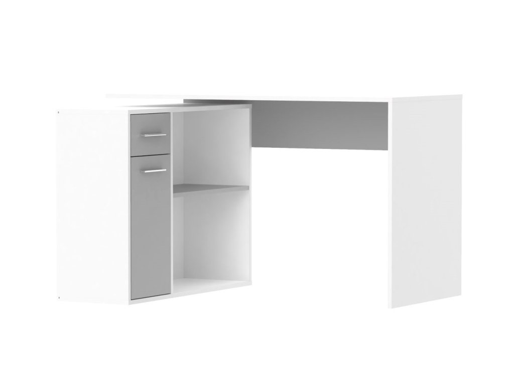 Stůl nabízí velký odkládací a úložný prostor, který je rozdělen na otevřenou poličkovou část a na uzavřenou část, která nabízí také praktickou zásuvku a dvířka s poličkou. Stůl je vyroben z kvalitní lamino desky, která je nenáročná na údržbu. Bílé barevné provedení v kombinaci s šedou se hodí téměř do každého interiéru. Úchyty jsou ve stříbrné barvě. S psacím stolem budou spokojeni všichni, kdo oceňují pohodlí při práci.