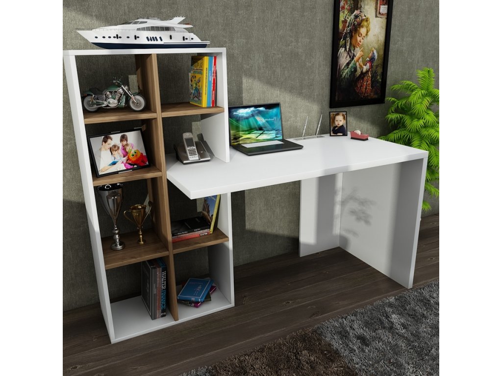 Pracovní stůl s regálem SHENDI bílá/ořech
