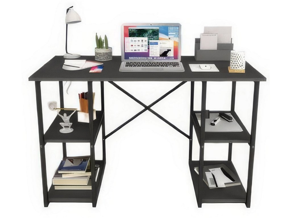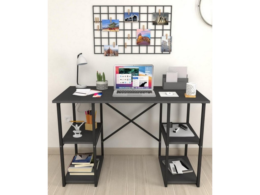 Psací stůl s praktickými policemi po stranách je vyroben z kvalitní desky LTD nenáročné na údržbu, v barevném provedení antracit. Tloušťka materiálu - 18 mm. Konstrukce je vyrobena z kovu v černé barvě. Dodáváme v demontovaném stavu.Doplňkové parametry