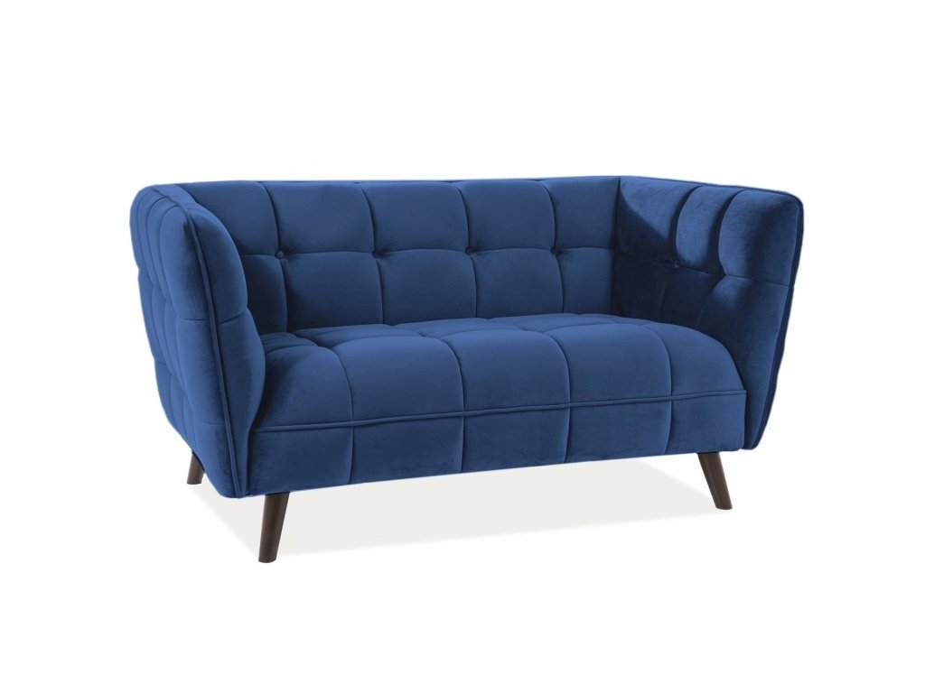 Čalounění je látkové sametové s ozdobným čtvercovým prošíváním. Pohovka stojí na šikmých dřevěných nožičkách v barvě wenge. V tomto designu naleznete v naší nabídce také stylové křeslo.