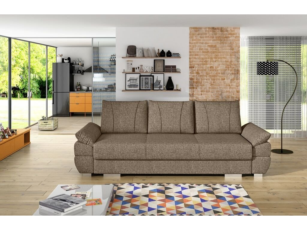 Pohovka je potažena kvalitní látkou v světle hnědém odstínu, která je odolná a snadno se udržuje. Součástí jsou tři velké opěrné polštáře pro lepší oporu.