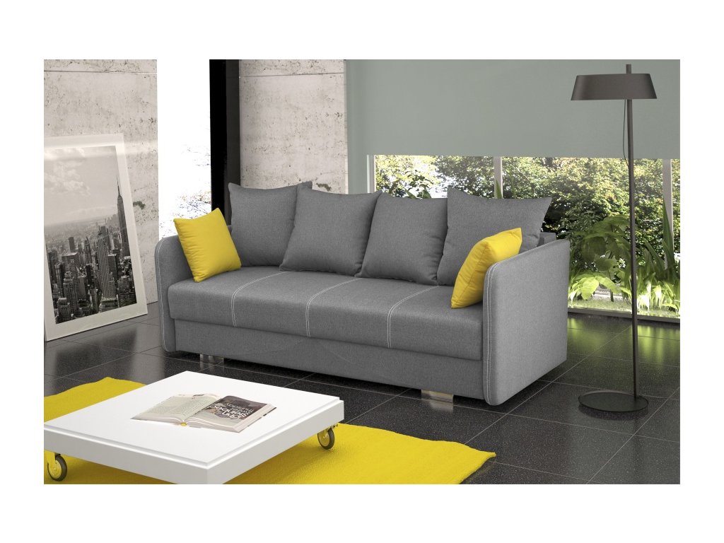 Moderní pohovka se snadným rozkladem pomocí automatu a úložným prostorem. Pohodlné sezení Vám zajistí kombinace pružin faliste a bonell s kvalitní PUR pěnou. Jednoduchým rozkladem pomocí automatu vznikne lůžko vhodné k příležitostnému spaní. Pohovku dodáváme v několika barevných provedeních, které také naleznete v naší nabídce. V ceně pohovky jsou 4 velké opěrné polštáře a dva malé žluté polštářky. Ostatní vyobrazené dekorace nejsou v ceně.