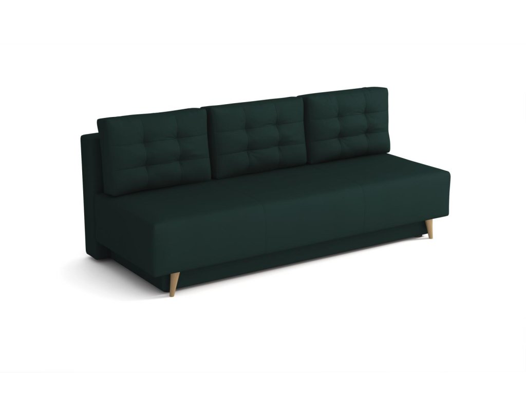 Pohovka Sebastian Velluto v tmavě zelené barvě kombinuje elegantní retro design s praktickým využitím. Zešikmené dřevěné nohy a látkové knoflíky na opěrných polštářích dodávají interiéru osobitý charakter.