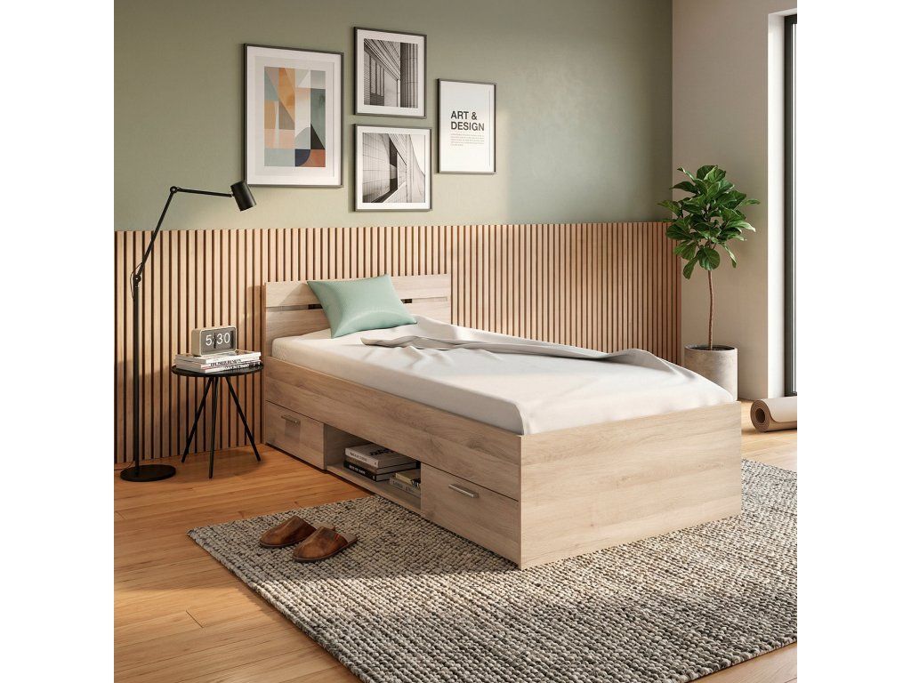 Multifunkční postel MICHIGAN v dekoru dub nabízí dvě prostorné zásuvky a otevřenou niku pro uložení ložního prádla nebo dalších věcí. Vše je součástí postele, což šetří místo v pokoji.