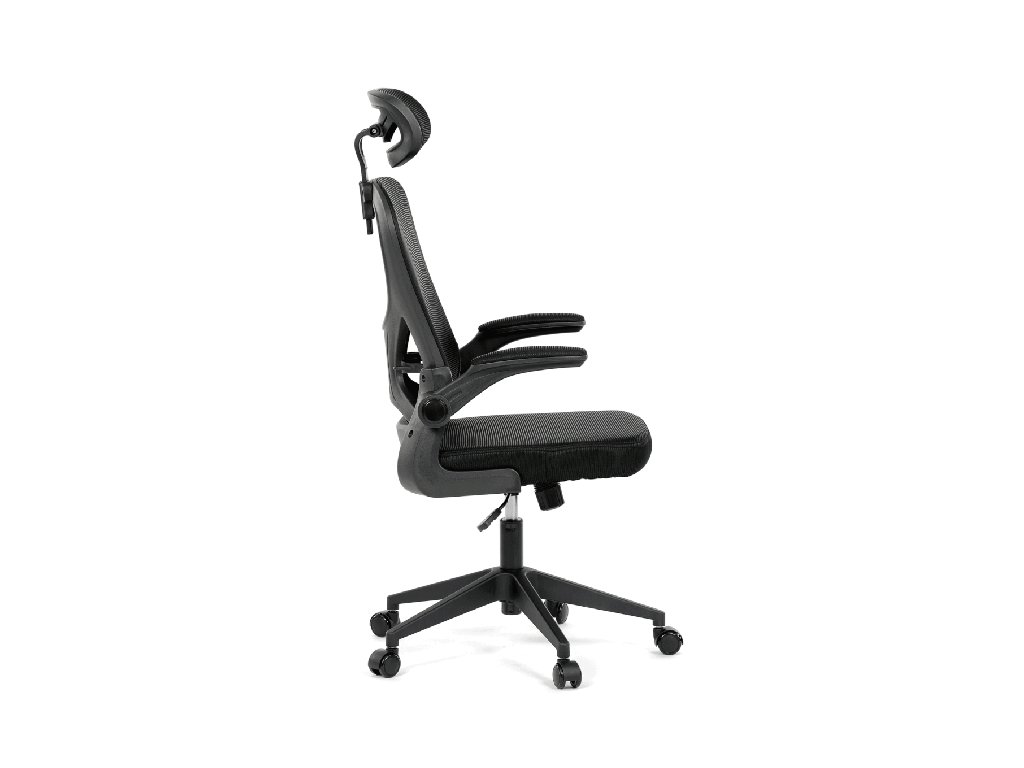 Černá židle s síťovinou a nastavitelnou opěrkou hlavy a bederní opěrkou poskytuje pohodlí při dlouhodobé práci. Ideální pro moderní kanceláře a home office.