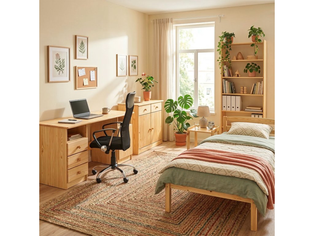 Stůl 8847 je vyroben z masivní borovice s lakovaným povrchem, který zajišťuje odolnost a snadnou údržbu. Nabízí pevnou a stabilní pracovní plochu vhodnou pro počítač i další kancelářské potřeby.