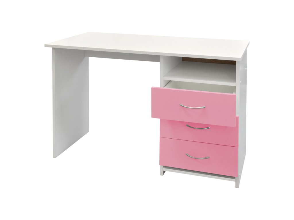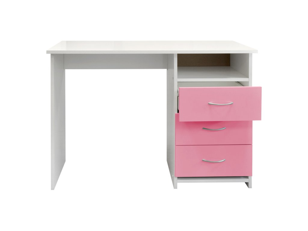 Psací stůl 44 v kombinaci růžové a bílé barvy nabízí dostatek prostoru pro práci i studium. Díky třem zásuvkám snadno uspořádáte kancelářské potřeby a dokumenty.
