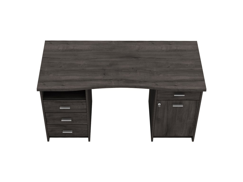 Stůl je vybaven zamykatelnou skříňkou s policí, nikou a čtyřmi zásuvkami s kovovými pojezdy, které umožňují přehledné uspořádání kancelářských potřeb a dokumentů.