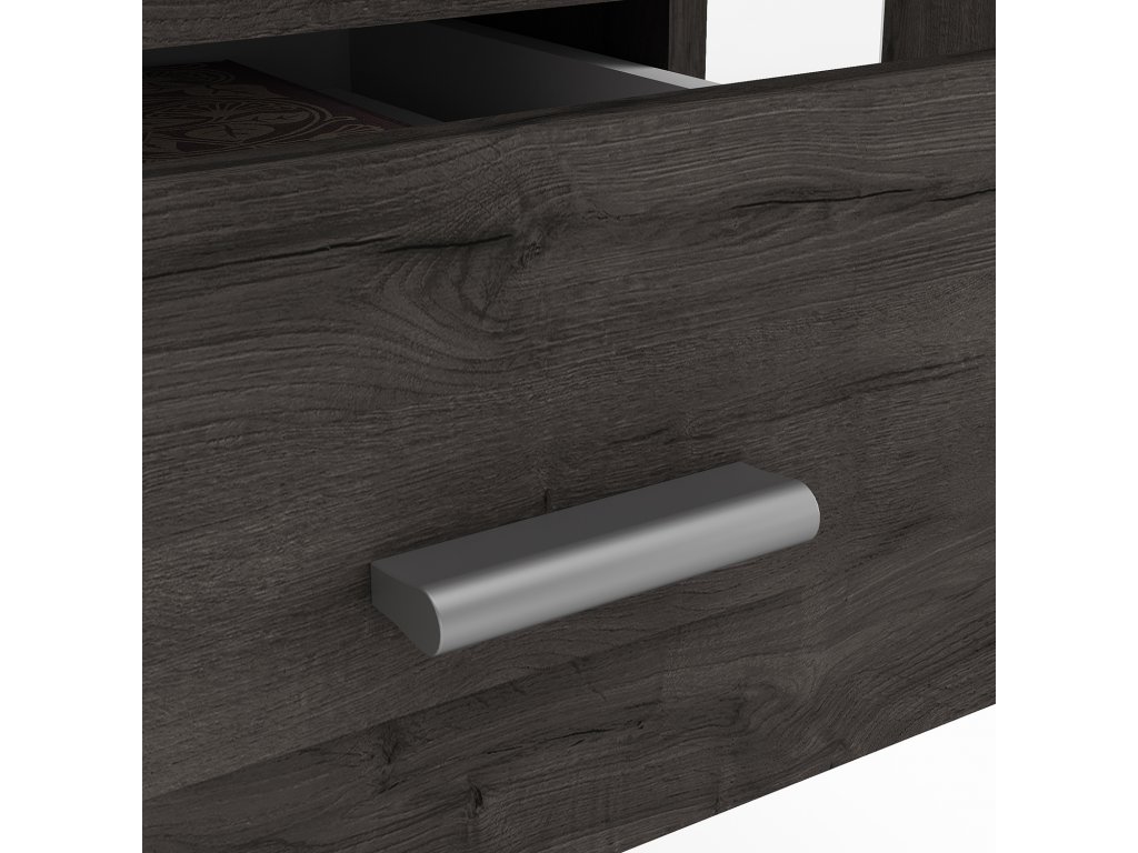Psací stůl MONACO 2 v dekoru tmavý dub nabízí dostatek místa pro práci i studium. Jeho ergonomický tvar s mírně vykrojenou přední hranou zvyšuje komfort při dlouhém sezení.