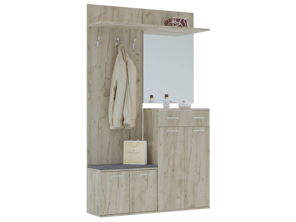 Vyrobena z laminátové desky v dekoru dub kraft šedý, odolná a snadno udržovatelná. Součástí je zrcadlo, věšák a komoda s zásuvkou, vše v kompaktním rozměru.