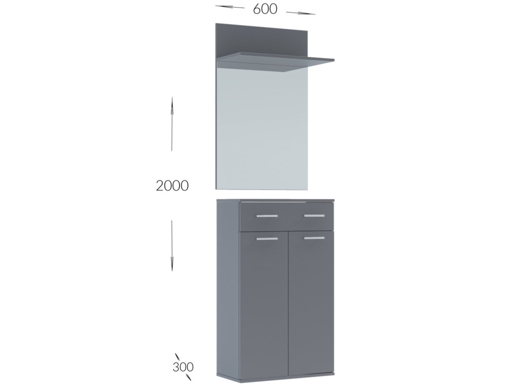 Sestava obsahuje panel s věšákem a komodou (60 x 200 x 30 cm) a panel se zrcadlem a botníkem. Dodává se v demontovaném stavu, snadná montáž.