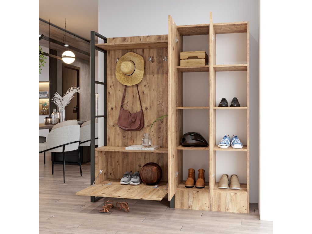 Předsíňová sestava přináší praktické řešení a moderní design do každé předsíně. Kombinace loftového a industriálního stylu s kvalitními materiály, jako je LTD a kov, vytváří jedinečný vzhled. Sestava obsahuje věšákovou stěnu se skříňkou a dvě skříně se zrcadlem, což zajišťuje dostatek úložného prostoru a funkčnost.