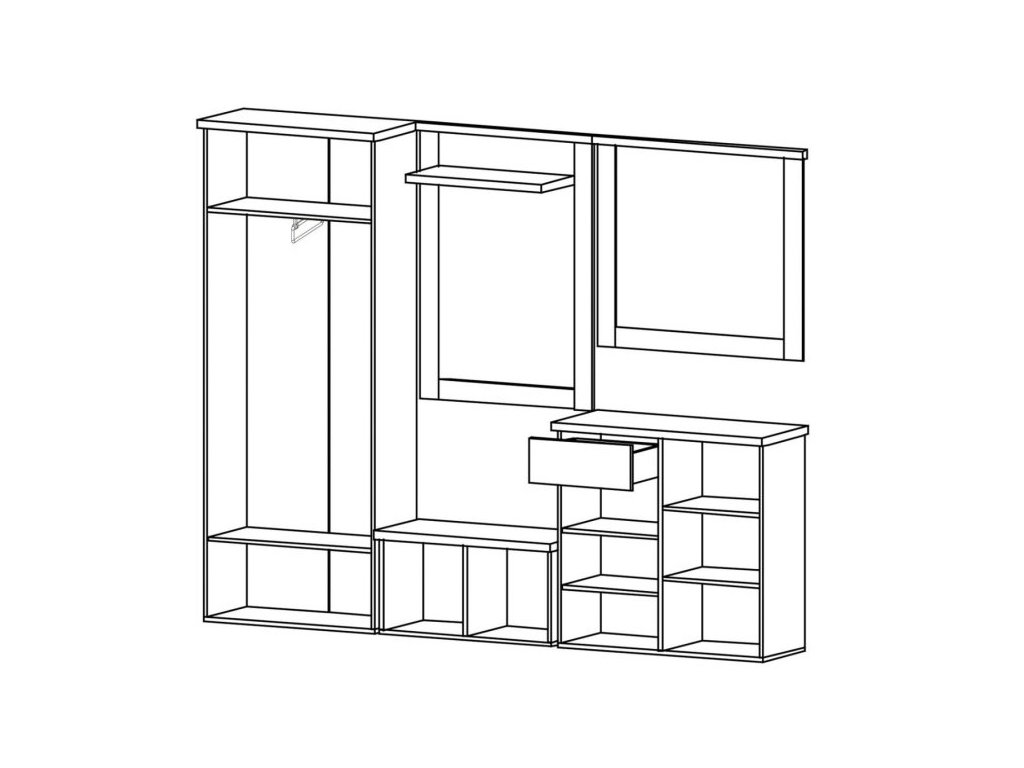 Předsíňový set ROLLY je ideální pro organizaci vstupního prostoru. Obsahuje zrcadlo, komodu, věšák, botník a skříň, které efektivně využijí prostor a usnadní ukládání obuvi, kabátů a doplňků.