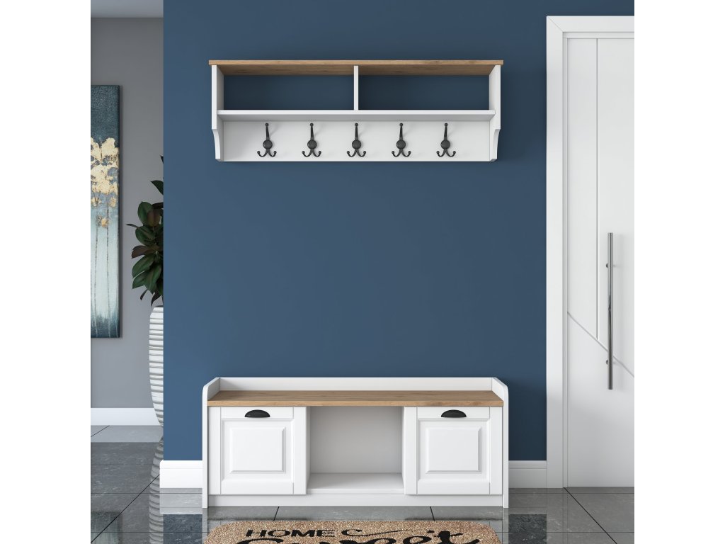 Moderní a funkční řešení pro organizaci vaší předsíně. Kombinuje úložný prostor na obuv a zavěšení oděvů v elegantním designu bílé a ořechové barvy.