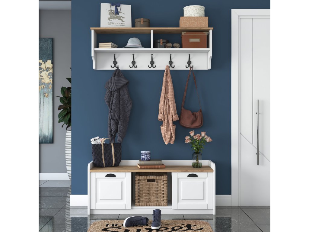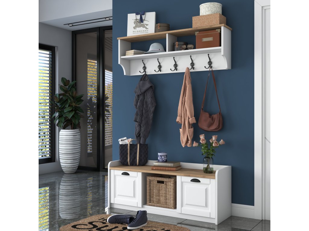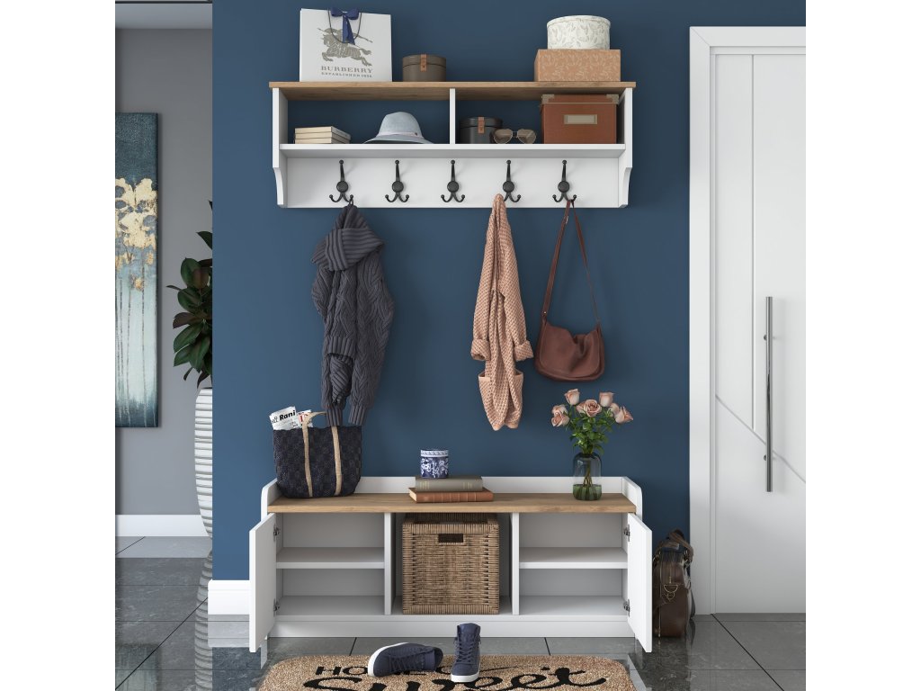Kompletní sestava s botníkem a věšákem nabízí efektivní využití prostoru. Snadná montáž a odolný materiál zajišťují dlouhou životnost.