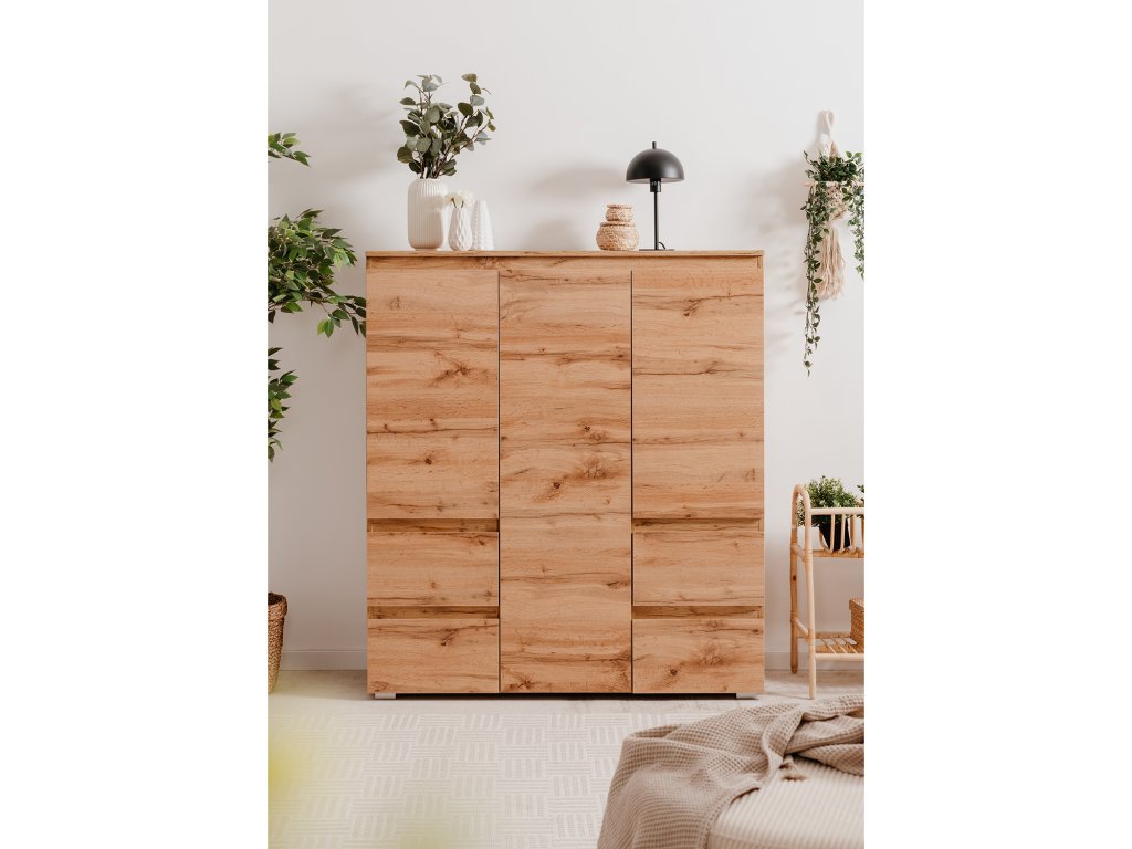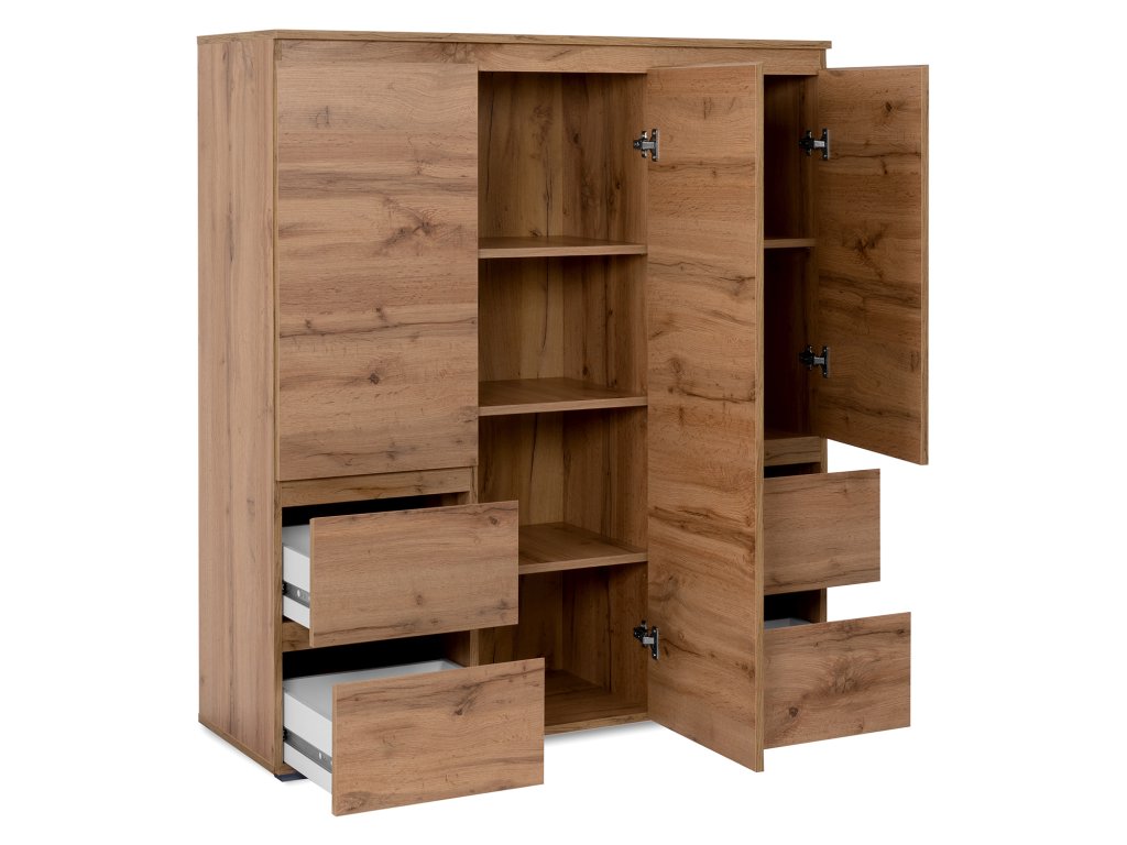 Elegantní zlatý dub dodává nábytku moderní vzhled, který se hodí do různých stylů interiérů. Příborník má 3 dveře, 5 variabilních polic a 4 zásuvky s kovovými pojezdy, což zajišťuje dostatek úložného prostoru.