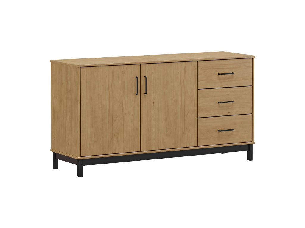 Vyroben z masivní borovice s bukovým provedením, doplněný černými kovovými úchytkami a nohami. Nabízí 3 zásuvky s kovovými pojezdy a 2 dveře s policí uvnitř, což umožňuje efektivní skladování.