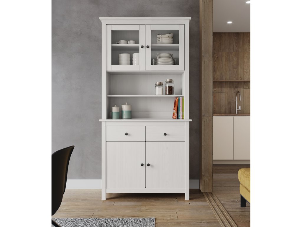 Vyroben z masivu borovice s bílým lakem, který je snadno udržovatelný a odolný vůči běžnému opotřebení. Kovové úchytky dodávají moderní vzhled.