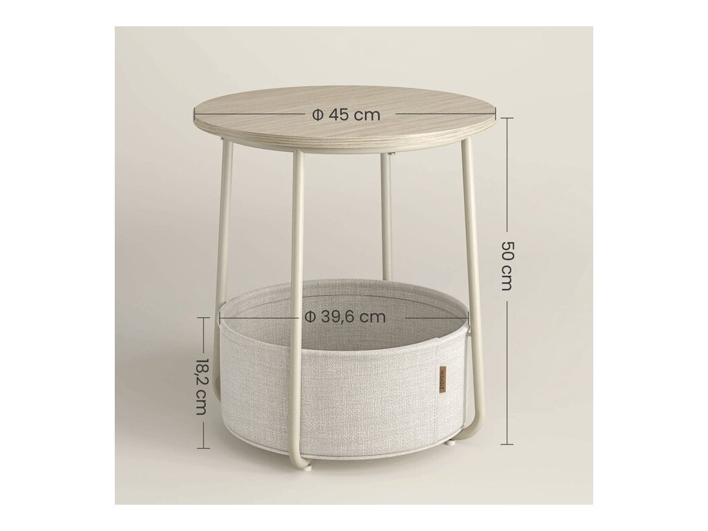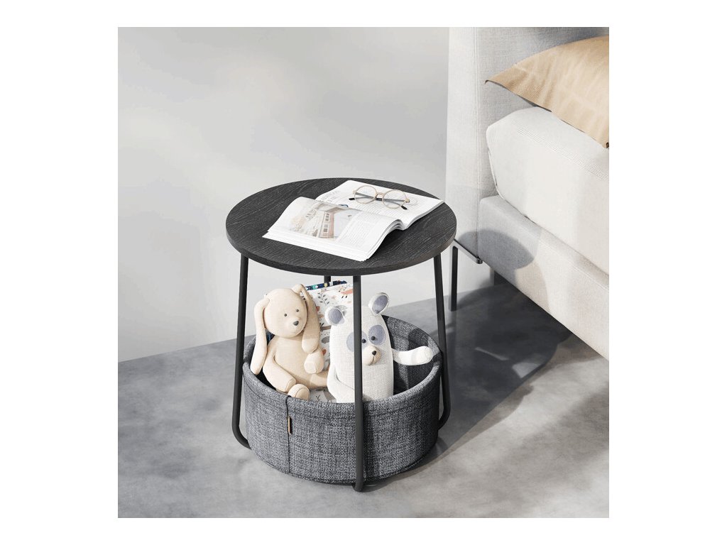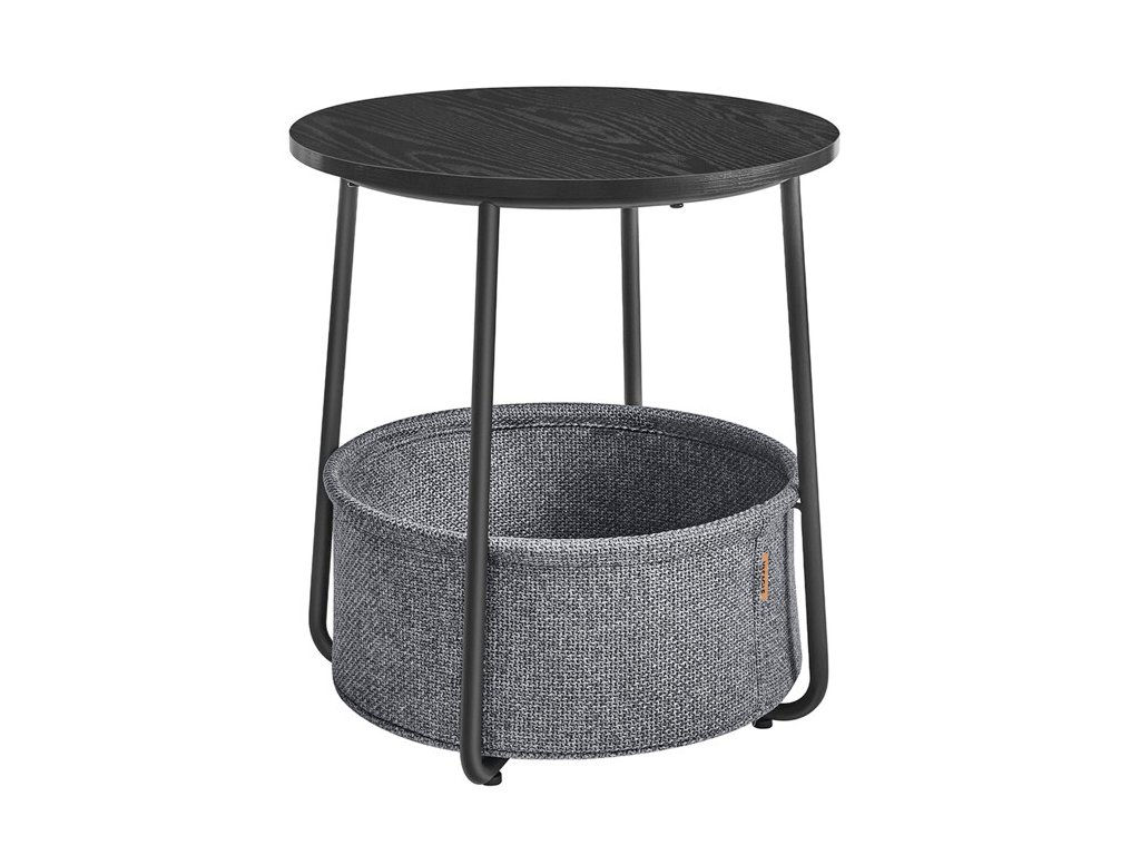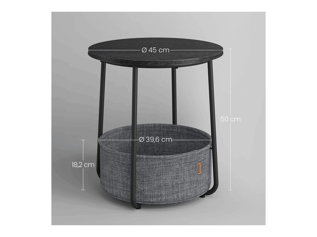 Kulatý odkládací stolek o průměru 45 cm a výšce 50 cm nabízí praktický prostor pro odložení drobností díky textilnímu koši umístěnému pod deskou. Deska je vyrobena z MDF s černým dekorem, který doplňuje černé kovové nohy s jemně zaoblenými tvary, jež zajišťují stabilitu a moderní vzhled. Textilní koš je pevný a snadno přístupný, ideální pro uložení časopisů, dek nebo jiných předmětů. Kompaktní rozměry stolku umožňují jeho využití v obývacím pokoji, ložnici či pracovně jako praktický doplněk s úložným potenciálem.