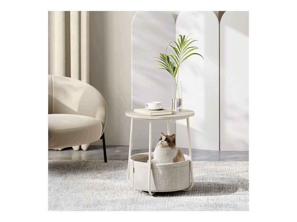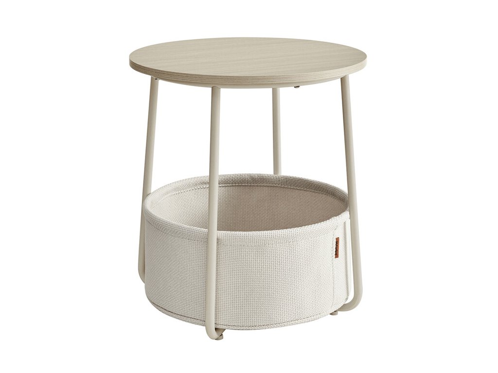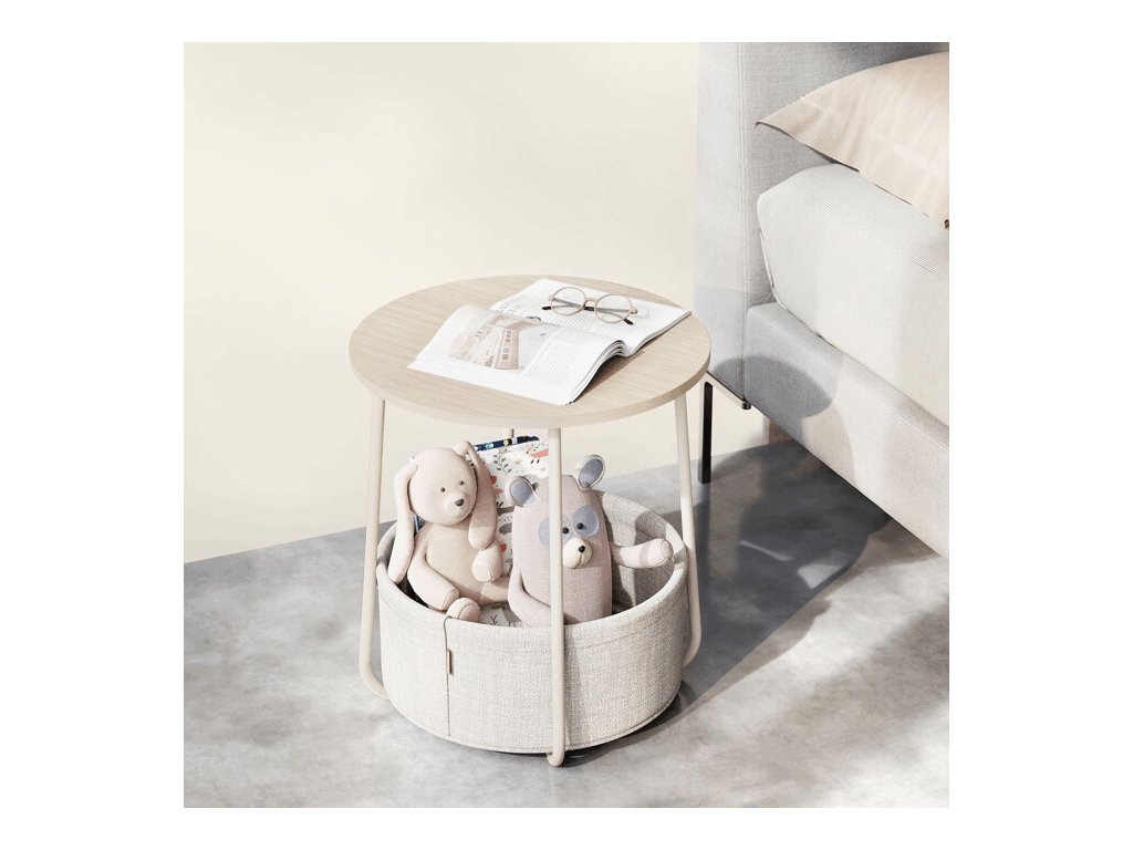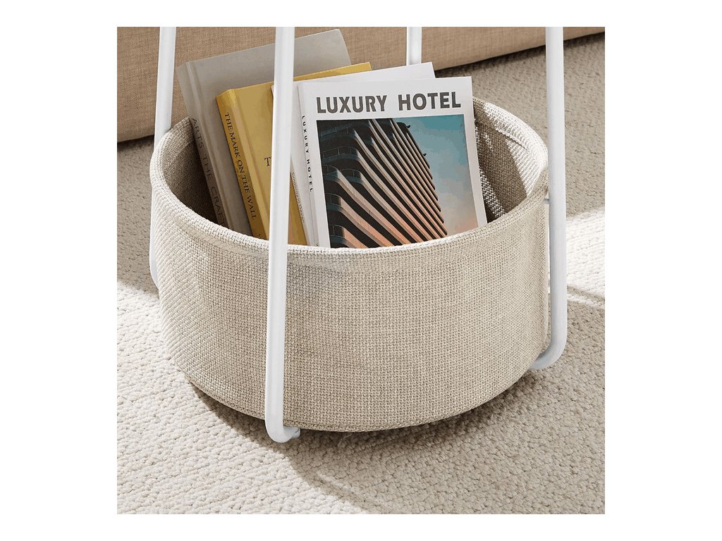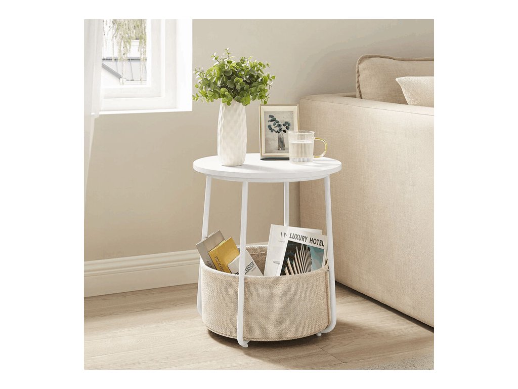 Kulatý odkládací stolek o průměru 45 cm a výšce 50 cm nabízí praktický prostor pro odložení drobností díky textilnímu koši umístěnému pod deskou. Deska je vyrobena z MDF s černým dekorem, který doplňuje černé kovové nohy s jemně zaoblenými tvary, jež zajišťují stabilitu a moderní vzhled. Textilní koš je pevný a snadno přístupný, ideální pro uložení časopisů, dek nebo jiných předmětů. Kompaktní rozměry stolku umožňují jeho využití v obývacím pokoji, ložnici či pracovně jako praktický doplněk s úložným potenciálem.