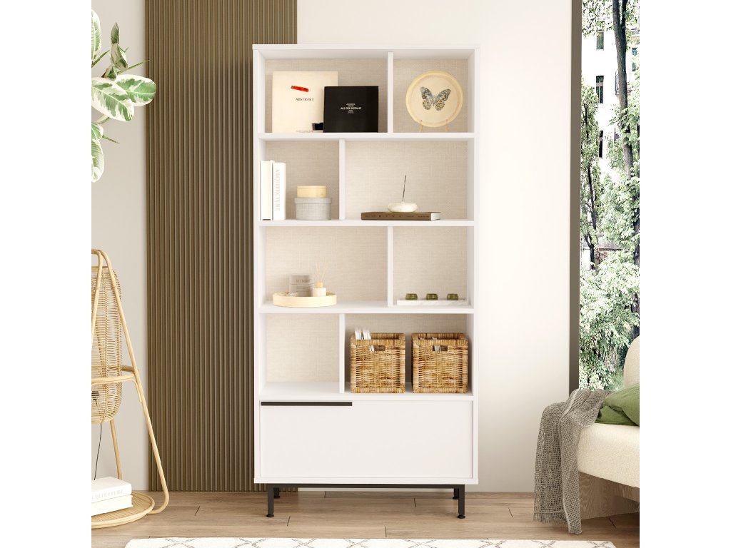 kombinuje praktičnost a moderní styl. Čtyři otevřené police jsou ideální pro vystavení knih nebo dekorací, zatímco plné dvířko poskytuje uzavřený prostor pro uschování dalších předmětů. Díky svému elegantnímu designu a funkčnímu uspořádání se tato knihovna hodí do jakéhokoli obývacího pokoje.