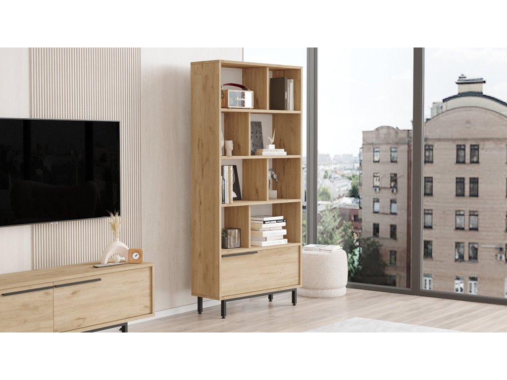 kombinuje praktičnost a moderní styl. Čtyři otevřené police jsou ideální pro vystavení knih nebo dekorací, zatímco plné dvířko poskytuje uzavřený prostor pro uschování dalších předmětů. Díky svému elegantnímu designu a funkčnímu uspořádání se tato knihovna hodí do jakéhokoli obývacího pokoje.