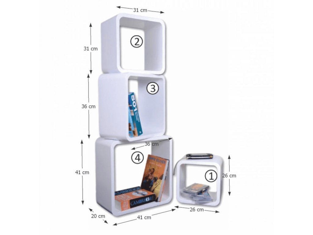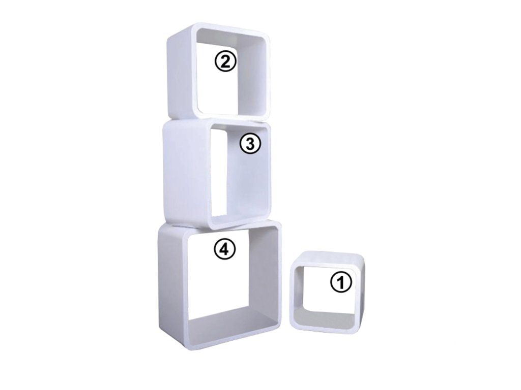 sada polic - 4 ks, materiál: MDF, provedení: bílá, rozměry ŠxVxH: 1 - 26x26x20 cm, 2 - 31x31x20 cm, 3 - 36x36x20 cm, 4 - 41x41x20 cm.Doplňkové parametry