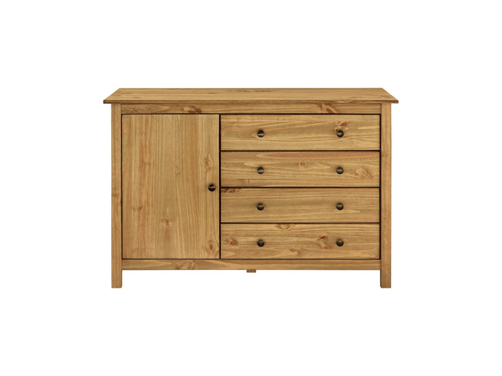 Komoda TORINO vosk nabízí kombinaci dvířek a čtyř zásuvek pro efektivní uspořádání domácích drobností i větších předmětů. Vhodná do obývacího pokoje, ložnice nebo pracovny.