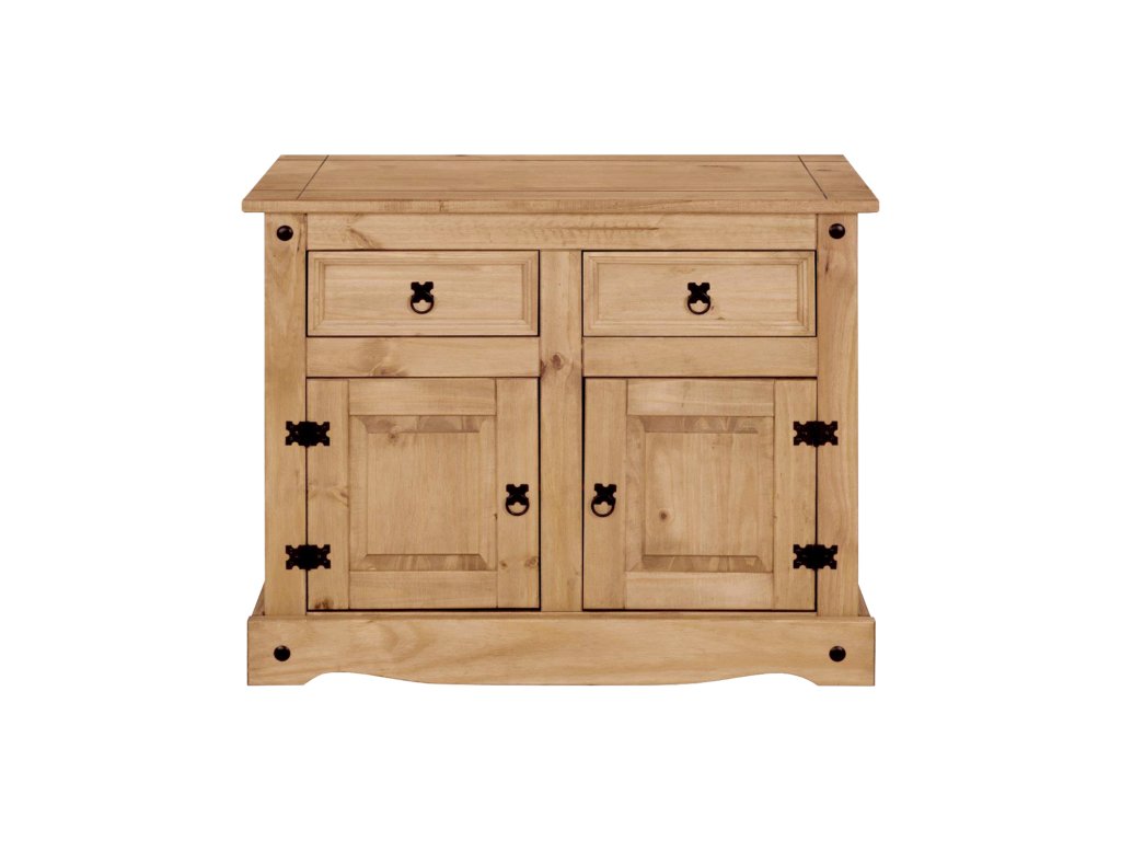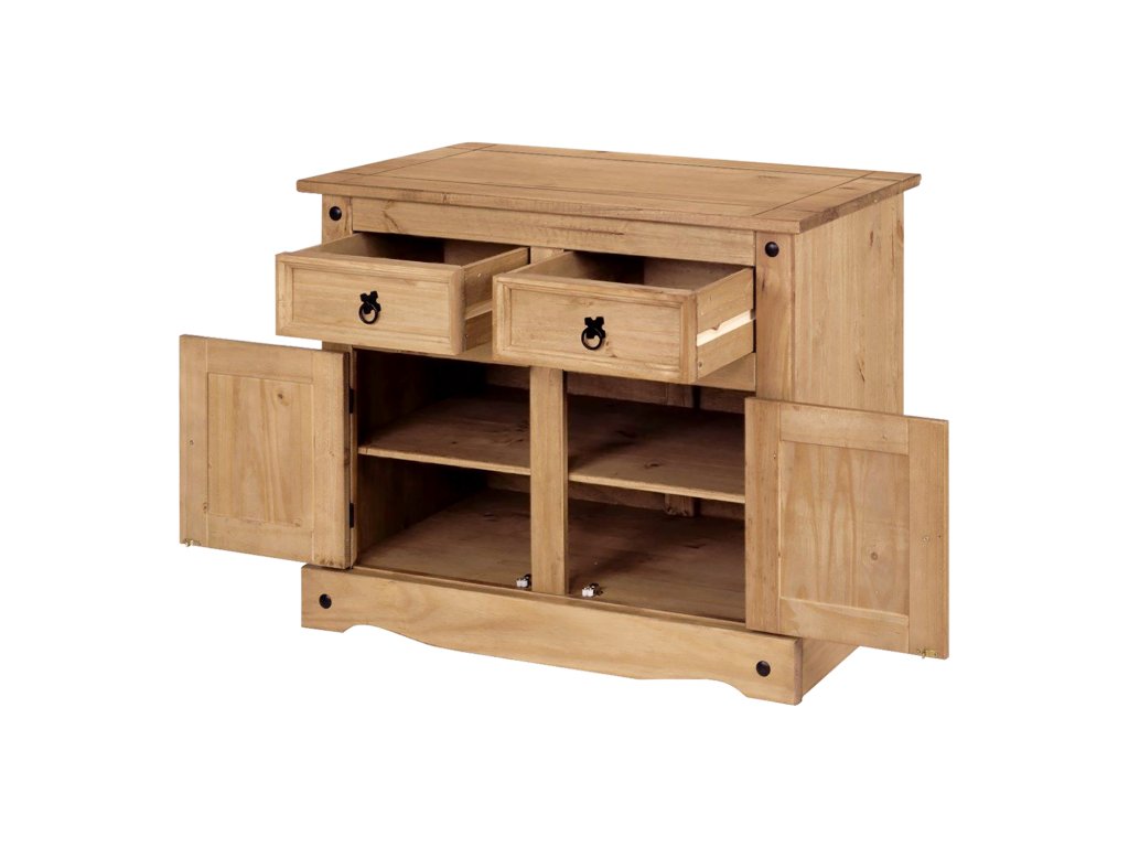 Kovové ozdobné úchytky doplňují rustikální vzhled komody a zároveň zajišťují pohodlné otevírání zásuvek a dveří. Komoda je součástí sestavy CORONA 3 pro snadné kombinování s dalším nábytkem.