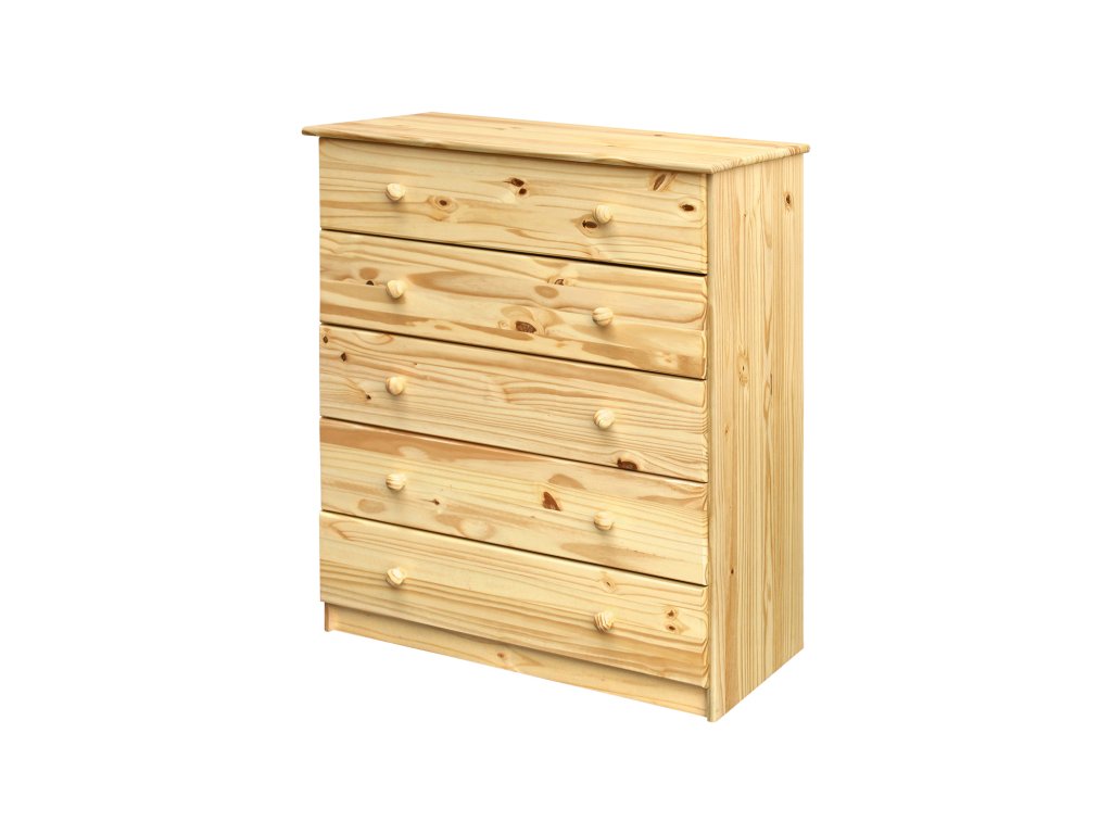 Komoda je vyrobena z masivní borovice s lakovaným povrchem, což zajišťuje pevnost a odolnost proti poškození.