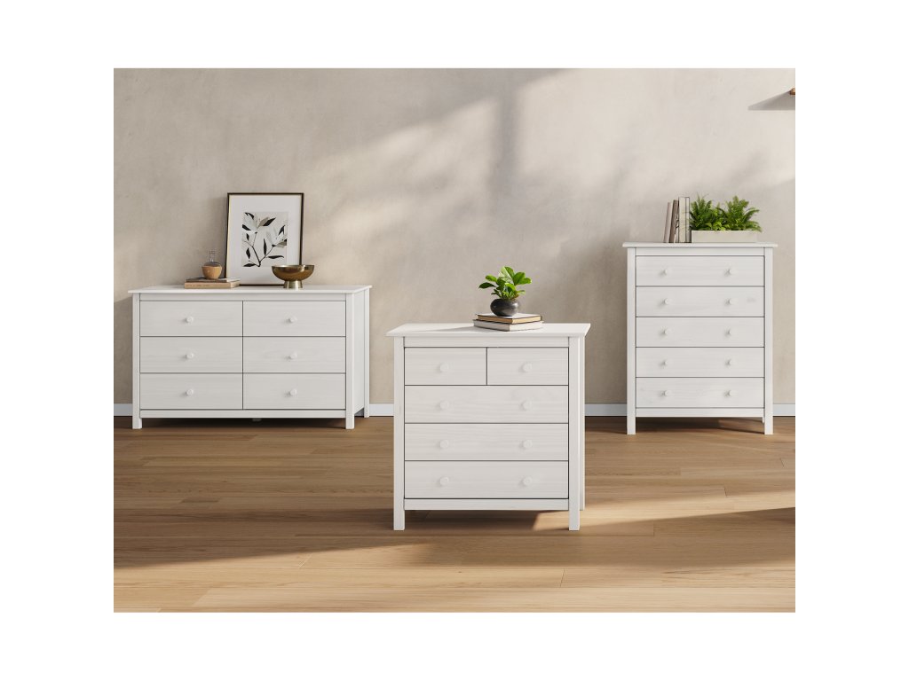 Komoda je vyrobena z masivní borovice s bílým lakem, což zaručuje pevnost a odolnost nábytku.