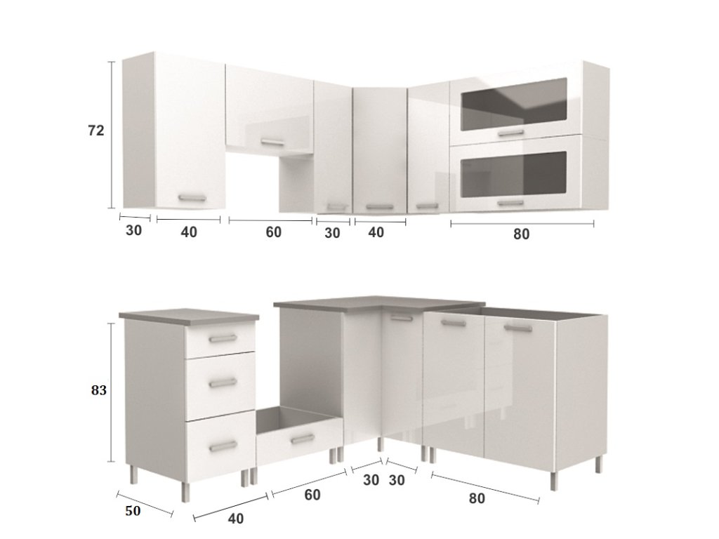 rohová skříňka 80x80 cm, v.83 cm Skutečný rozměr skříňky bez pracovní desky je 80x80 cm/ výška 83 cm, s pracovní deskou je rozměr 90x90 cm. V případě zájmu o dokoupení desky nad tuto skříňku, je potřeba objednat dělenou desku 90 a 30 cm.
