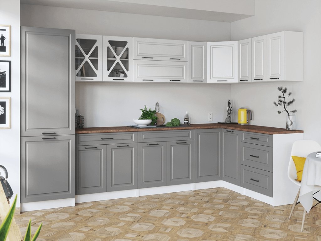 Bílý korpus s popelavě šedými dvířky v matném provedení dodává kuchyni svěží a moderní vzhled, který se hodí do různých stylů interiéru.