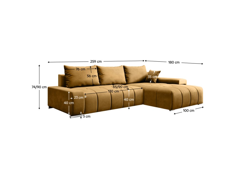 Rozměry jsou přibližně 259 cm na šířku, 180 cm na hloubku a výška 74 cm. Výška sedu je 40 cm.