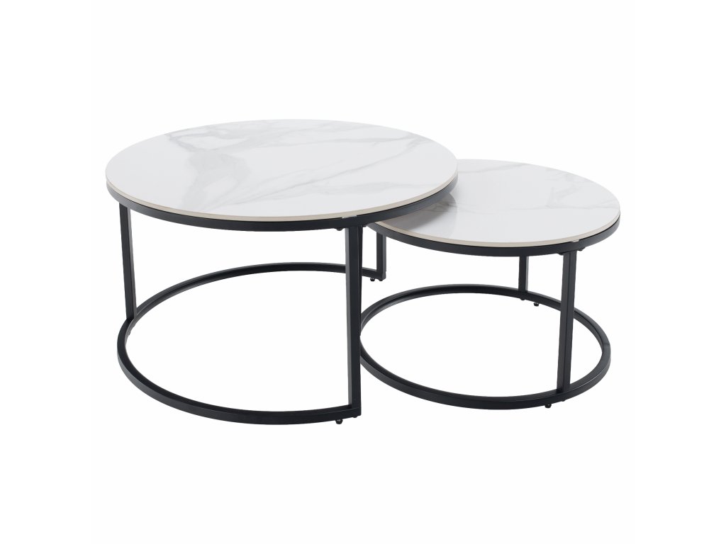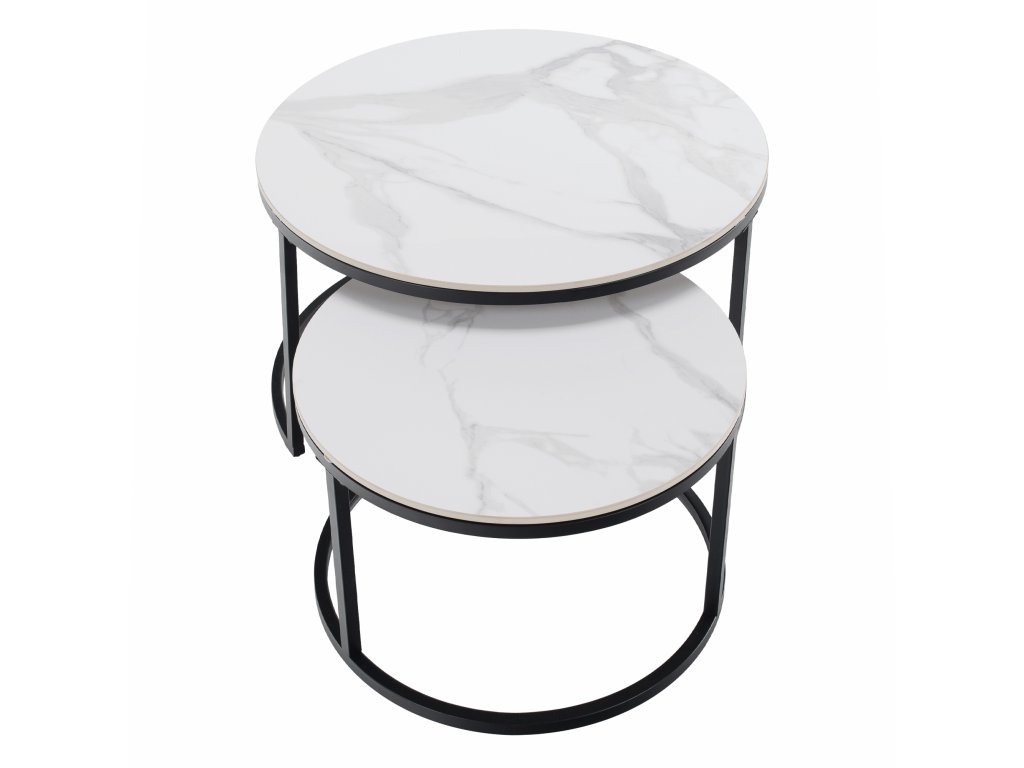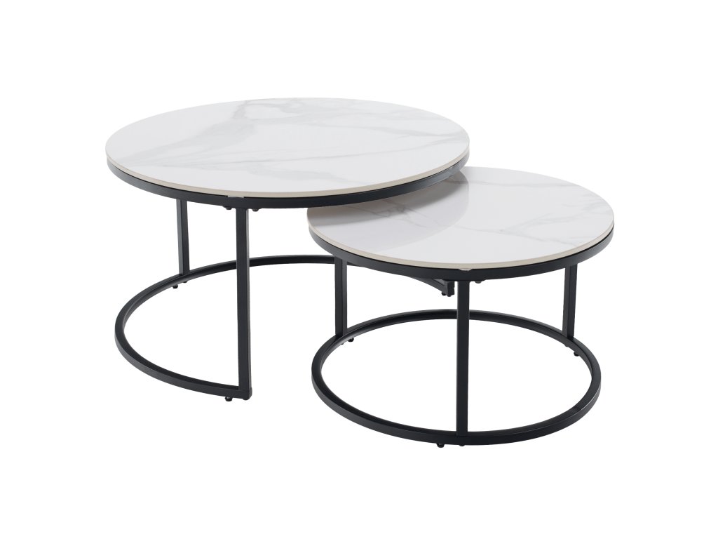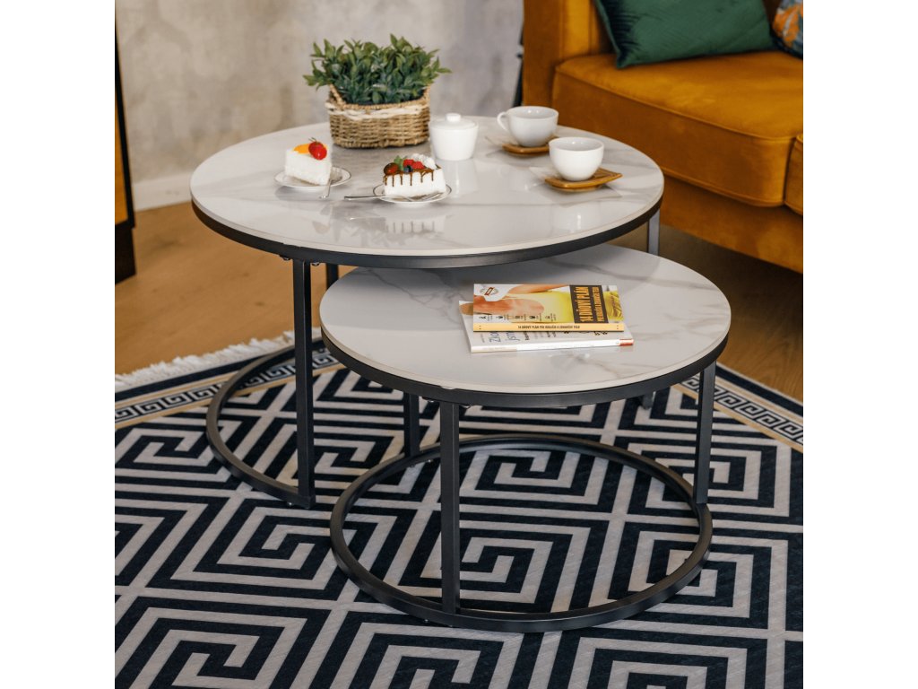 Set 2 kulatých stolů s bílým mramorovým povrchem a černou ocelovou konstrukcí je ideální do moderních obývacích pokojů nebo kanceláří. Vhodné pro odkládání nápojů, dekorací či časopisů.
