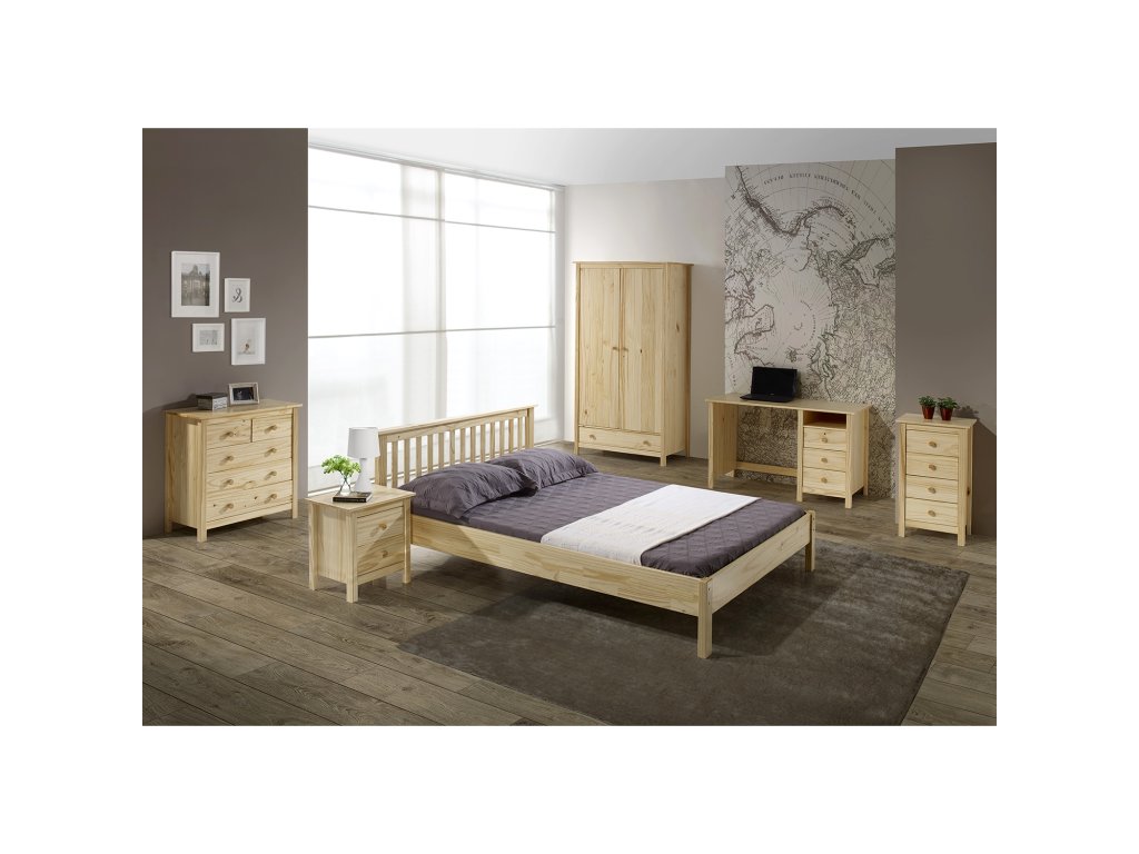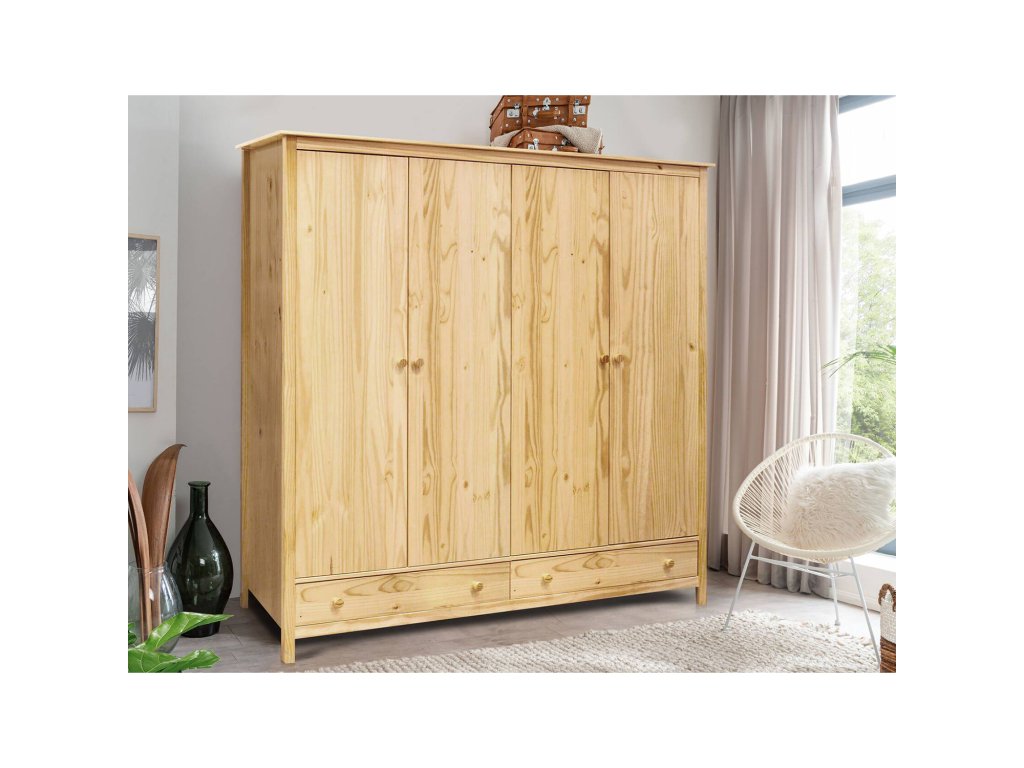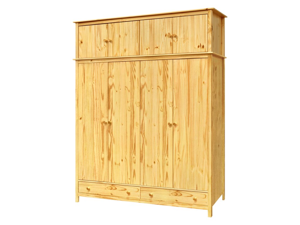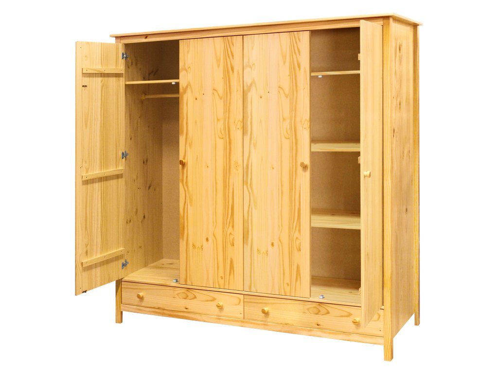 Skříň je vyrobena z masivní borovice s lakovaným povrchem, který zajišťuje odolnost a snadnou údržbu.
