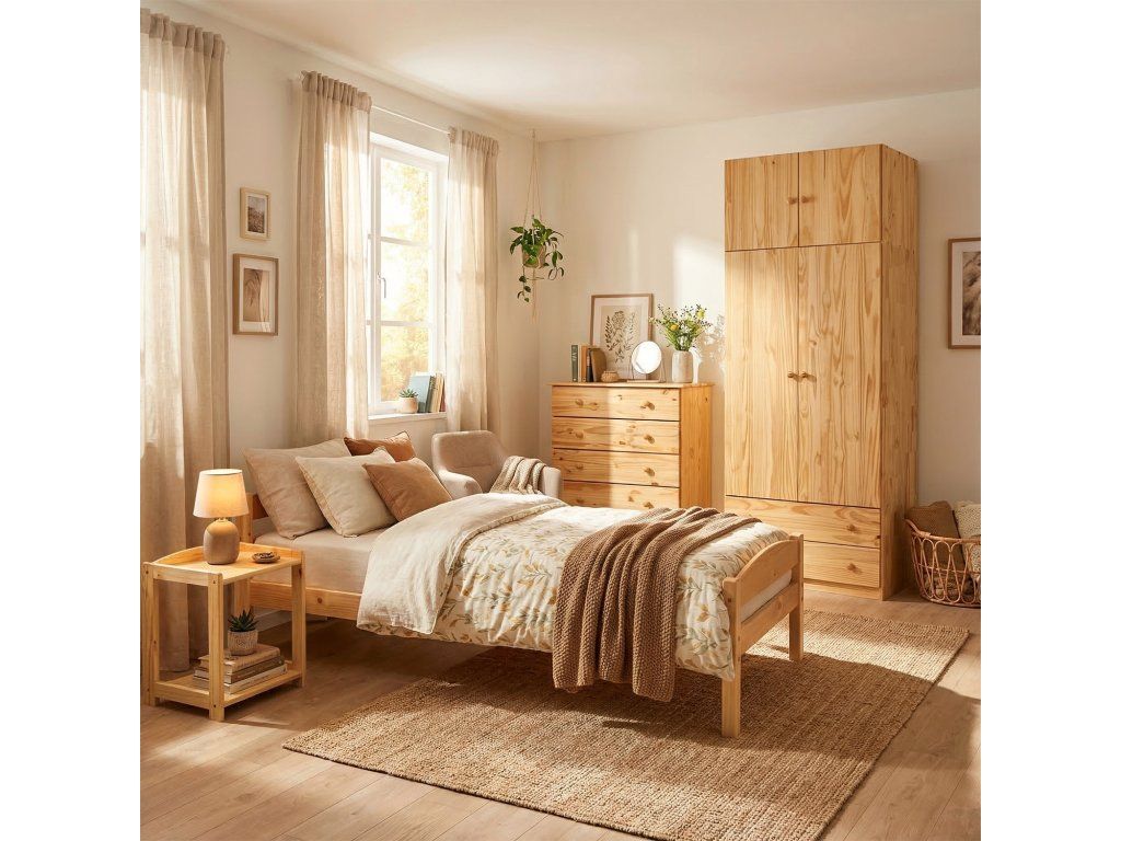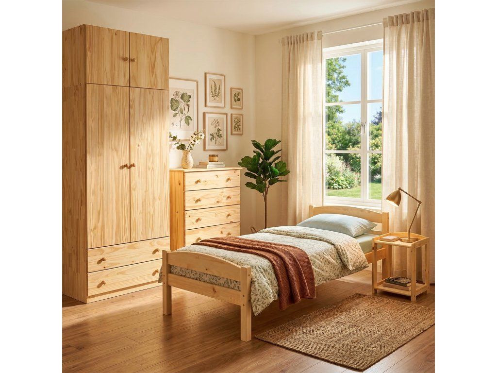 Vyrobena z masivu borovice s lakovaným povrchem, který zajišťuje odolnost a snadnou údržbu. Kovové pojezdy zásuvek zaručují plynulý chod a dlouhou životnost.