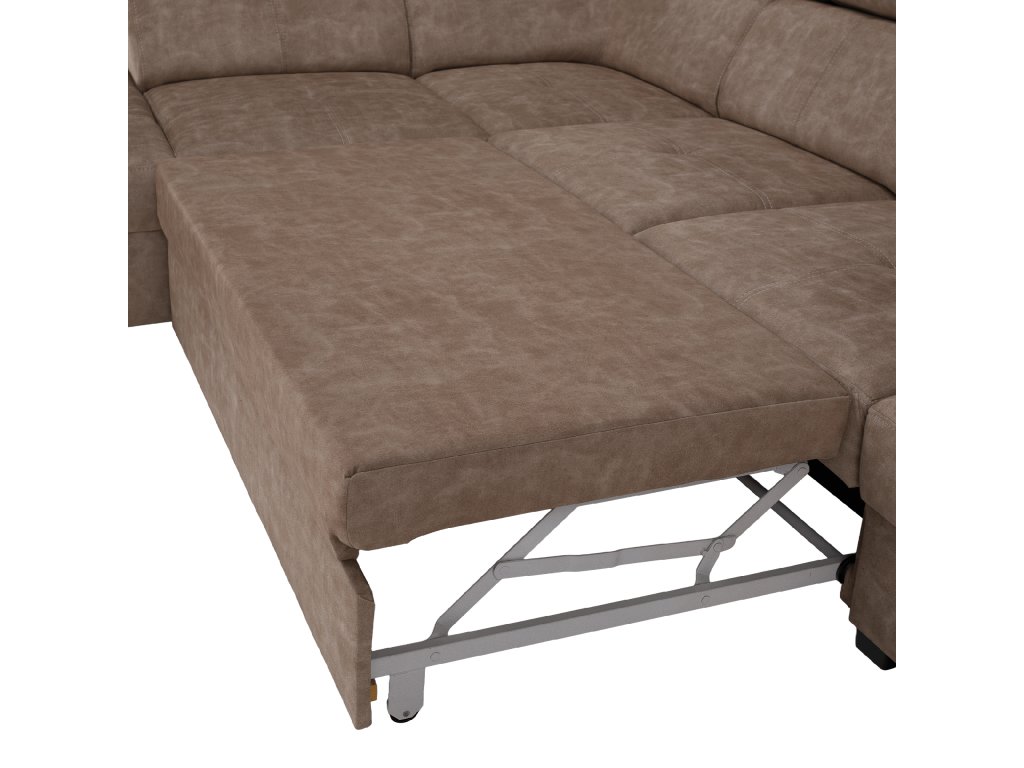 Souprava je rozkládací a nabízí pohodlné spaní. Má také úložný prostor pro lůžkoviny a polohovací opěrky hlavy pro větší komfort.