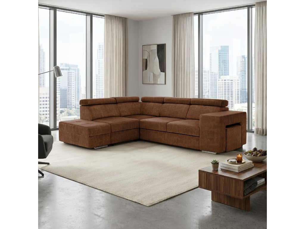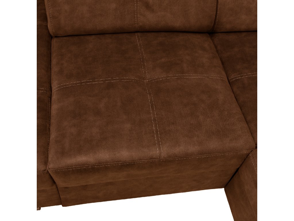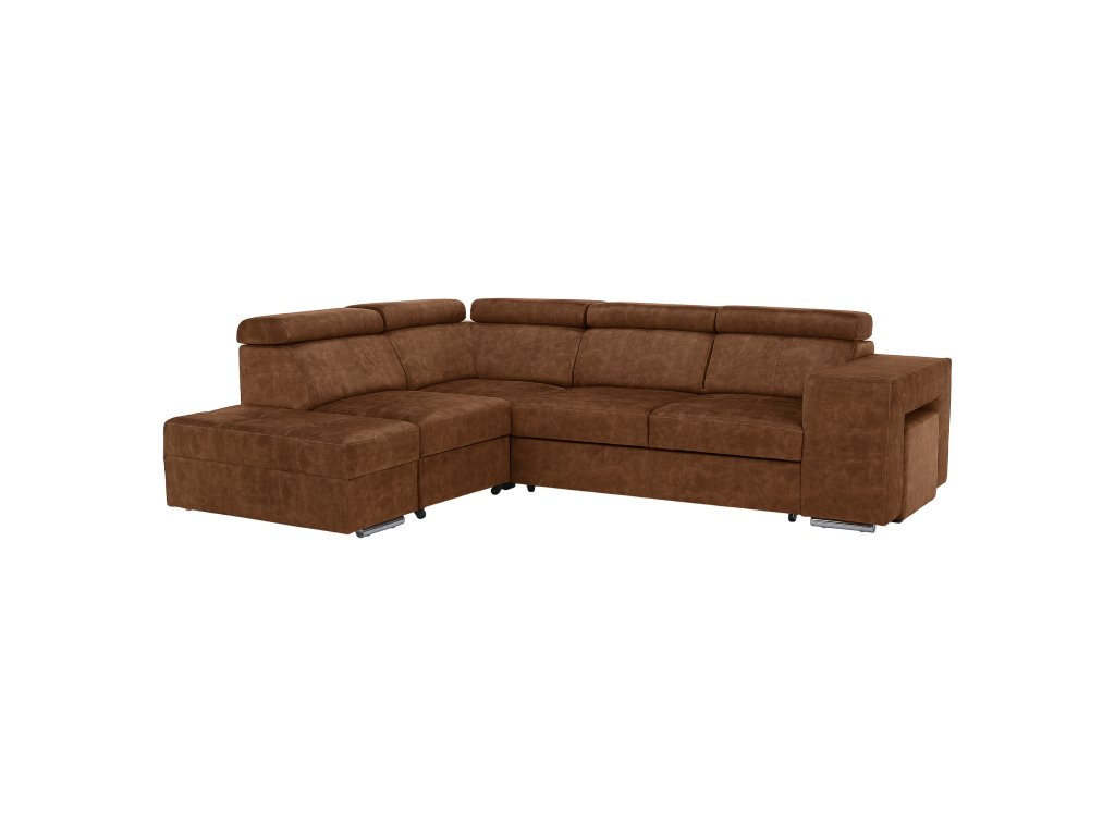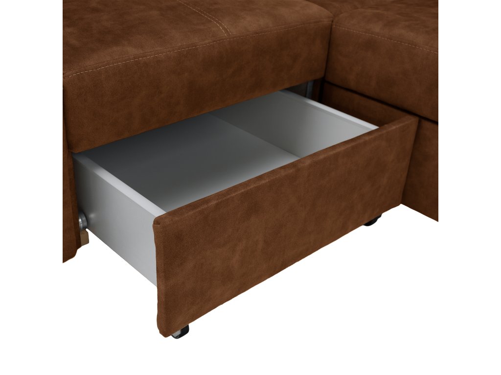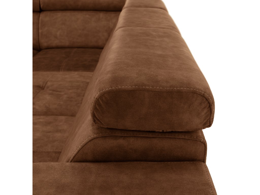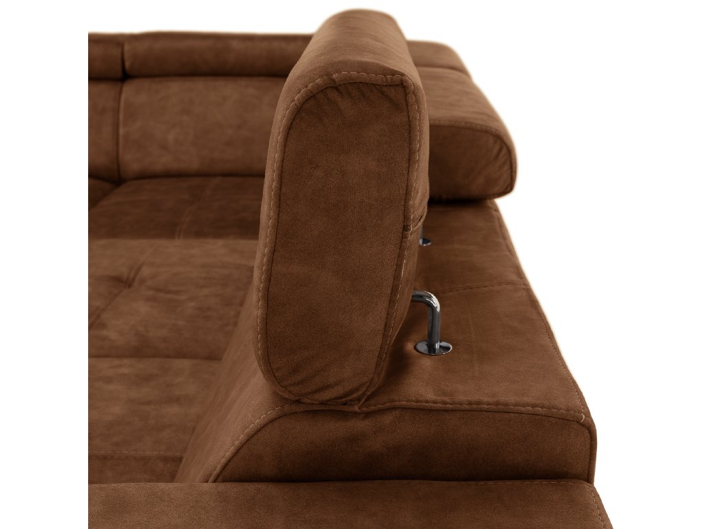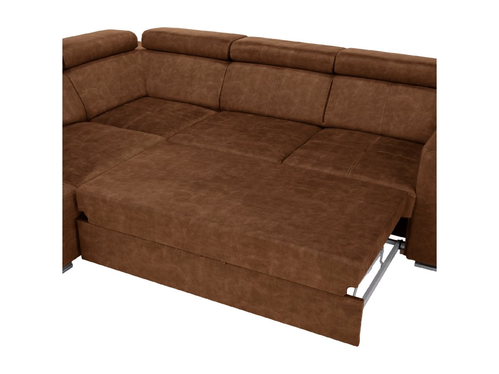Hnědá levá sedací souprava MALAGA nabízí komfortní posezení s možností rozkladu na spaní a úložným prostorem. Ideální do obývacích pokojů a společenských zón.