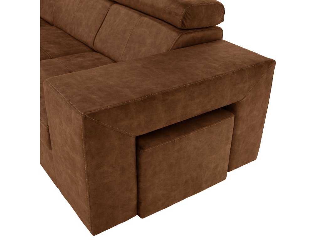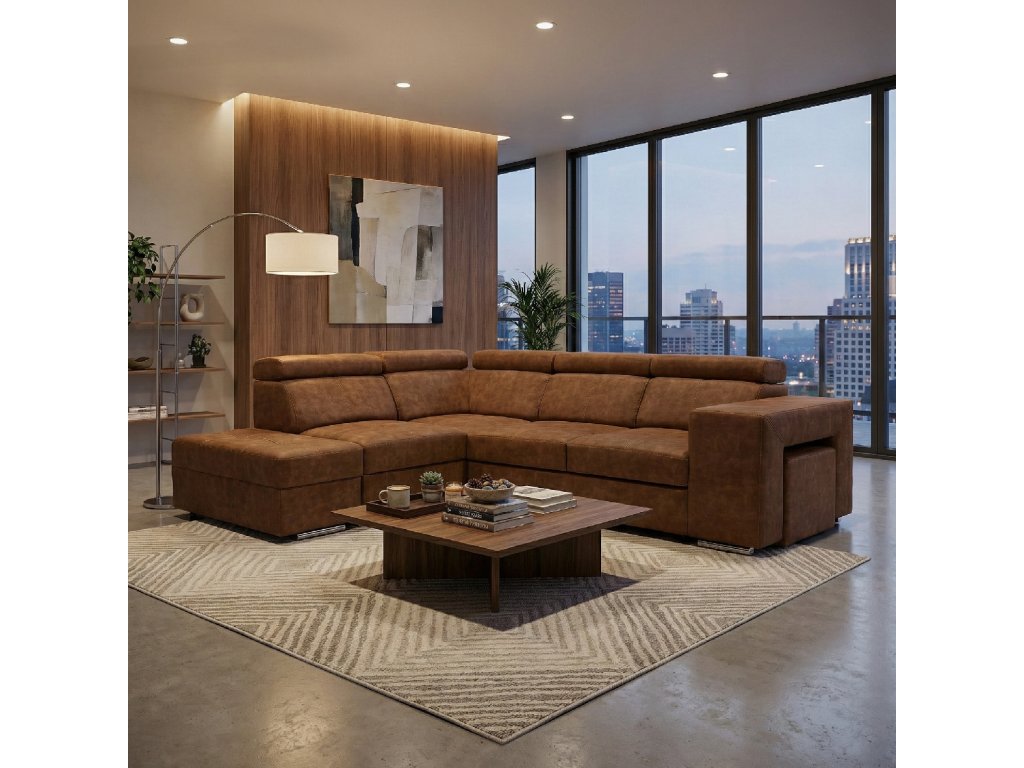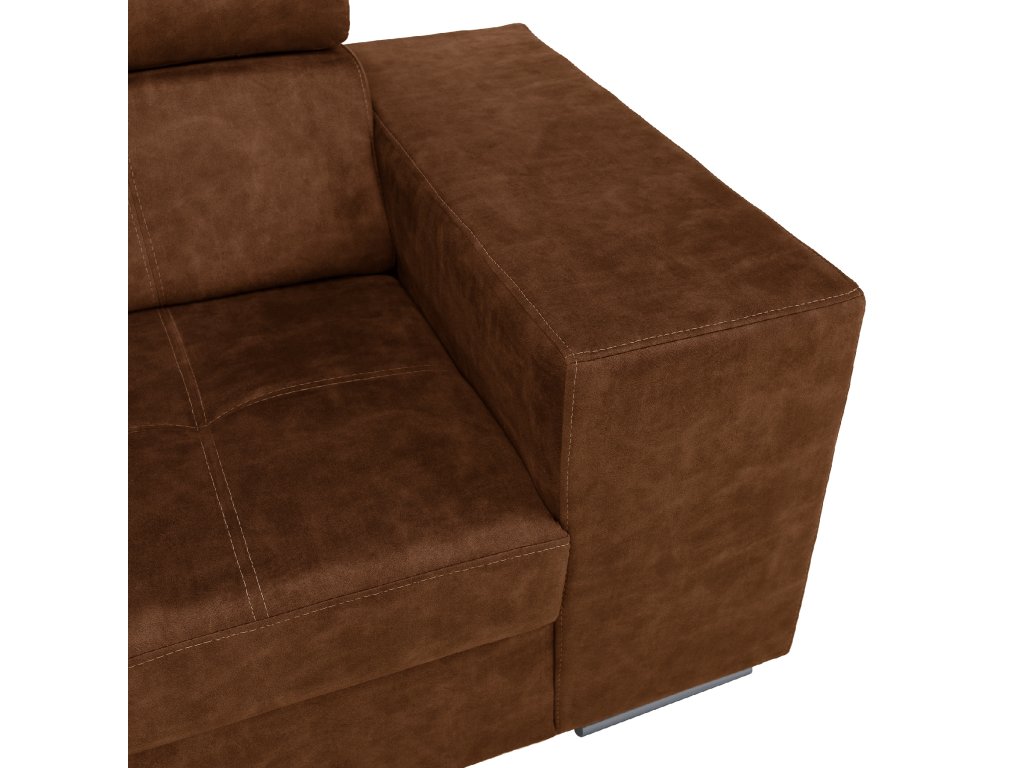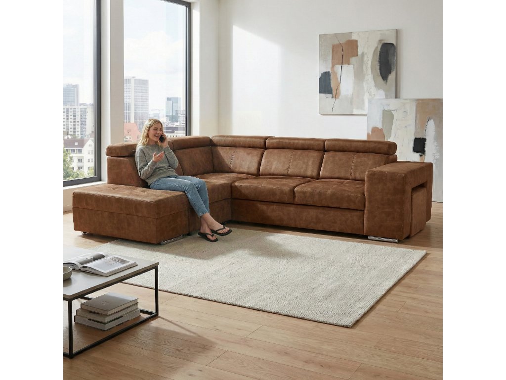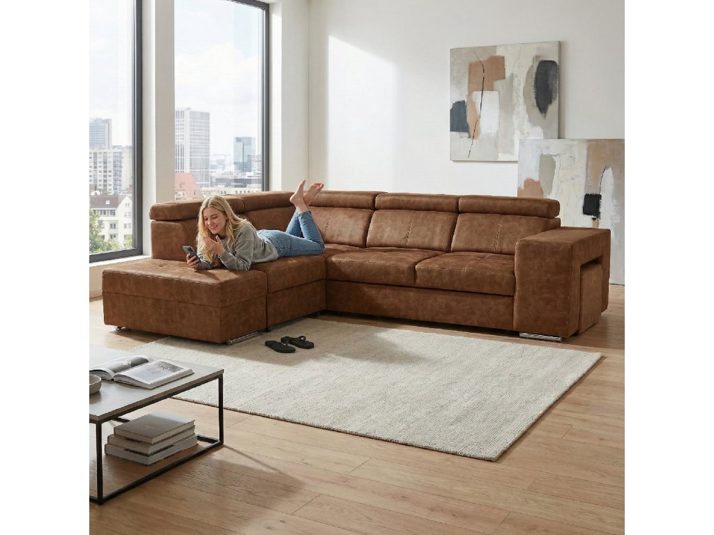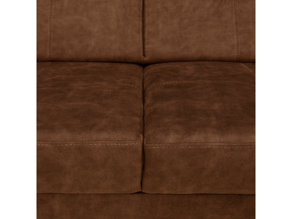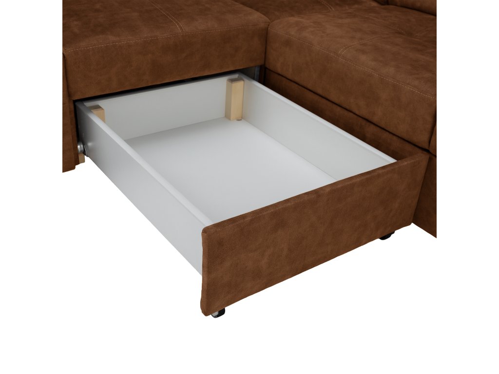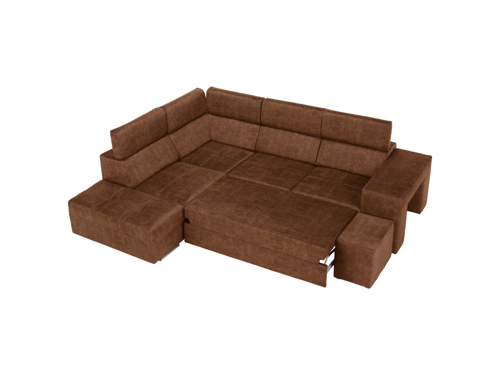 Hnědá levá sedací souprava MALAGA nabízí komfortní posezení s možností rozkladu na spaní a úložným prostorem. Ideální do obývacích pokojů a společenských zón.