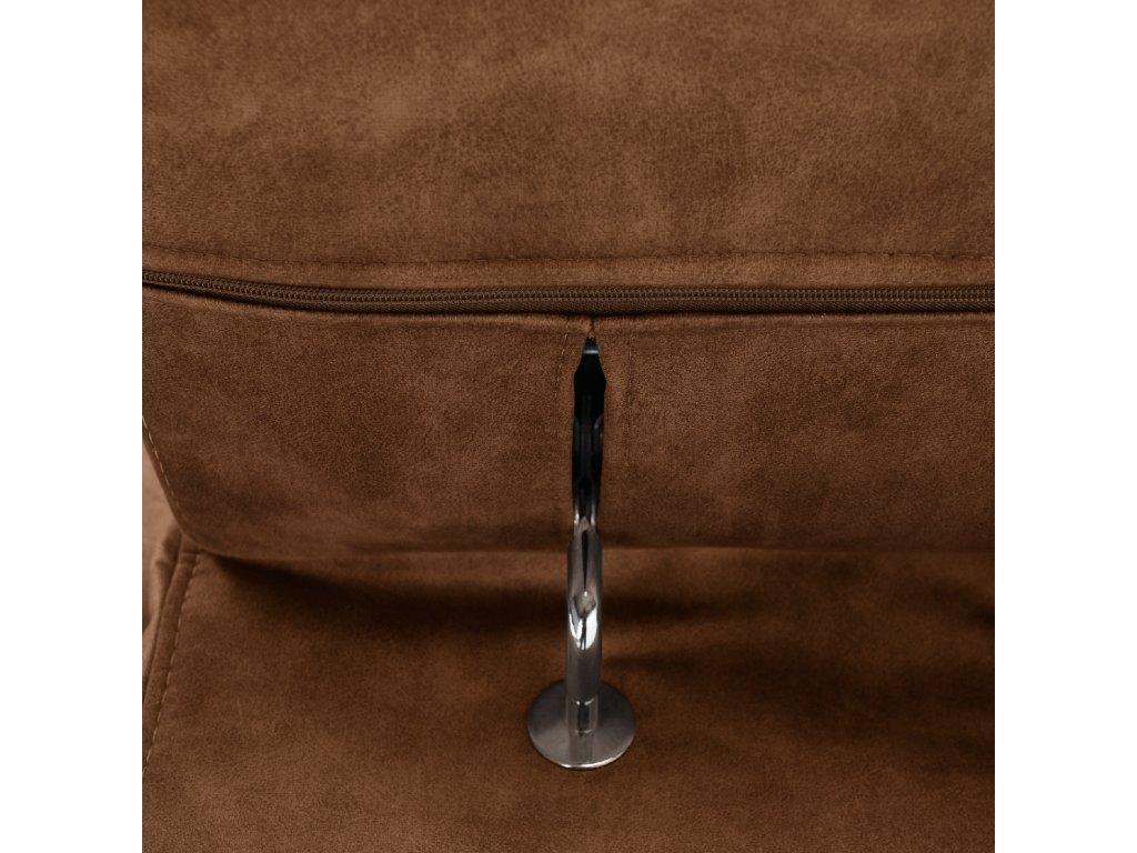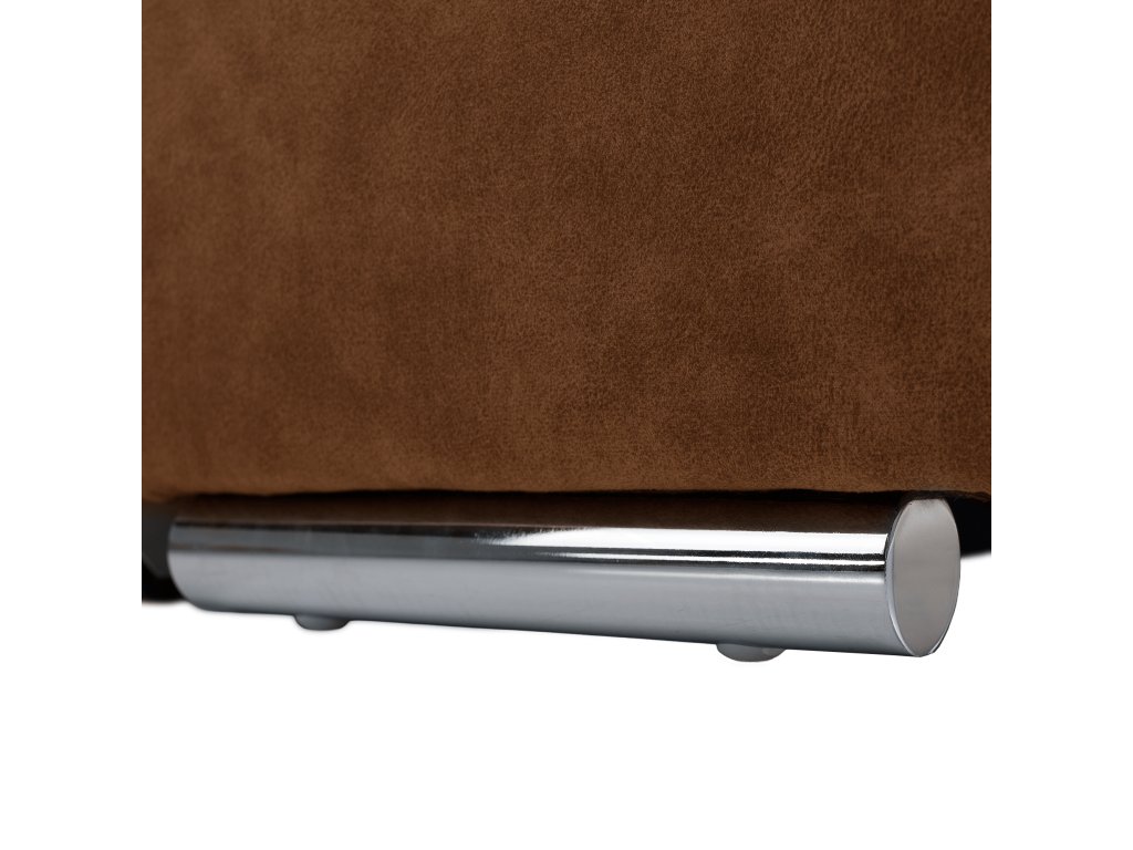 Čalounění z oděruodolné látky Country 8 v hnědé barvě, konstrukce z borového a bukového dřeva. Moderní vzhled na nožičkách s chromovým povrchem.