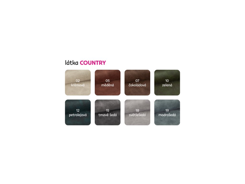 Souprava je dostupná v 8 barevných odstínech látky Country 8, přičemž základní varianta je hnědá.