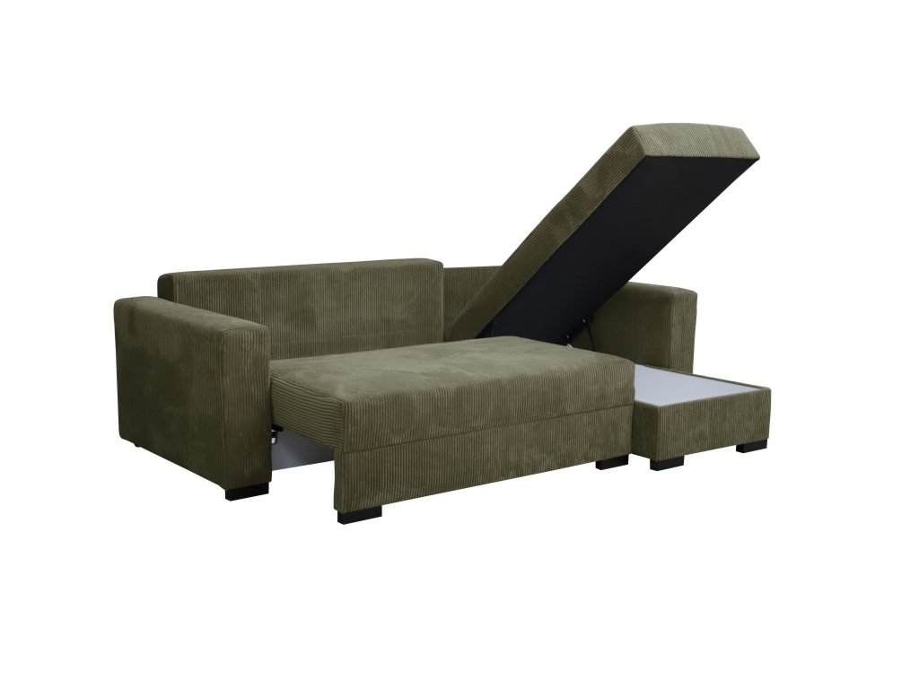 Souprava obsahuje úložný prostor a možnost rozložení na přespání. Potah je z jemné látky Poso, která připomíná manšestr a je snadno udržovatelná.