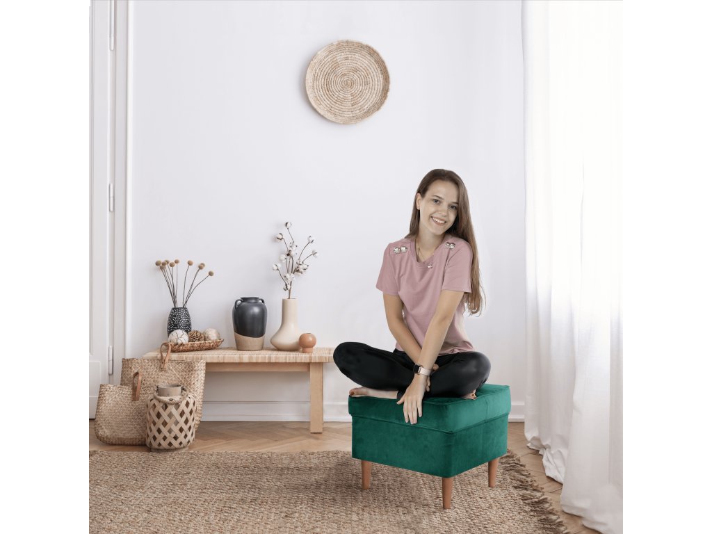 Rozměry 40x40x40 cm, výška nožiček 13 cm, nosnost do 110 kg. Barva je zelená s ořechovými nožičkami, které se mohou mírně lišit.