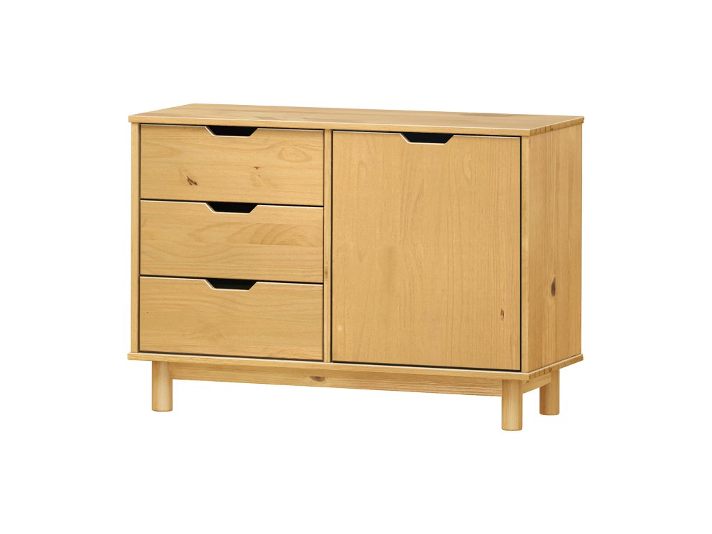 materiál masiv borovice voskovaná v medovém odstínu 3 zásuvky s kovovými pojezdy, 1 dvířka, 1 policeDoplňkové parametry