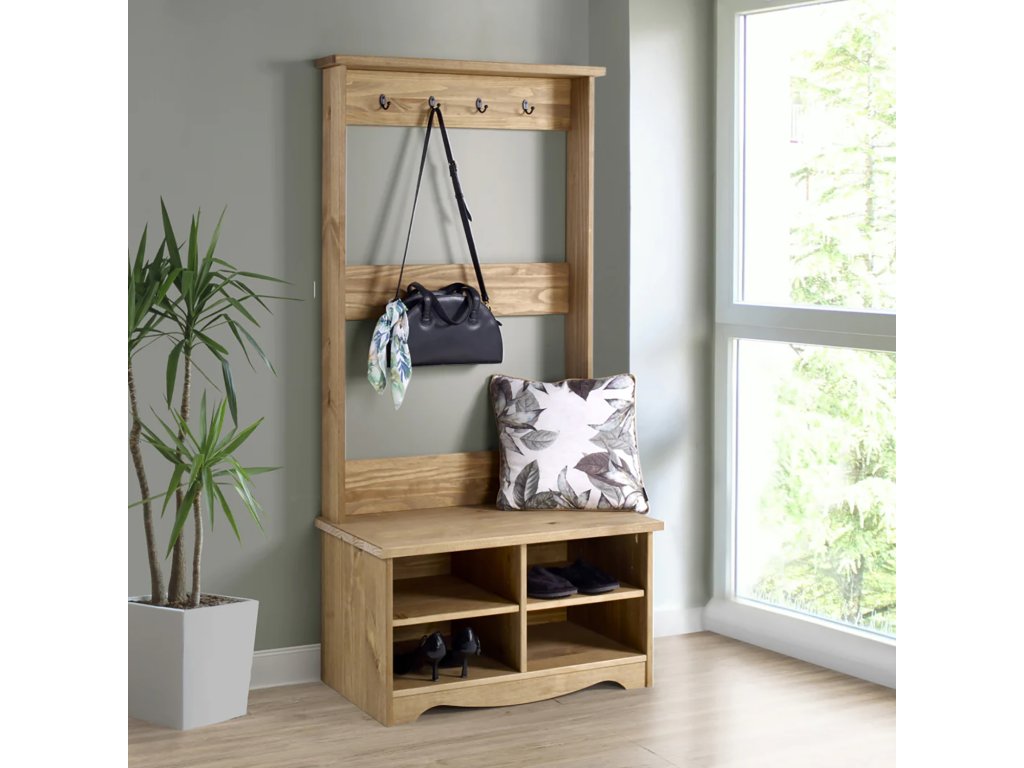 Vyrobena z masivní borovice s voskovaným povrchem v medovém odstínu. Odolná a snadno udržovatelná, s kovovými háčky a otevřenými policemi.