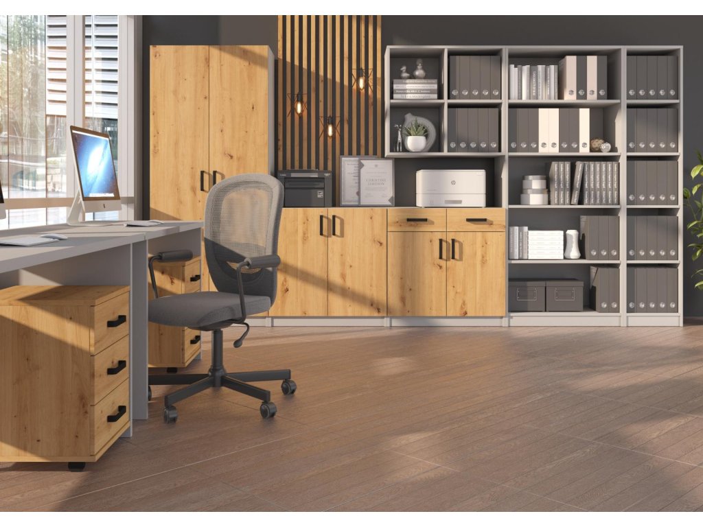 Lamino v dekoru dub artisan a světle šedá barva vytváří svěží a vzdušný vzhled, který se hodí do kanceláře i domácí pracovny. Jednoduchý design ladí s různými styly interiéru.