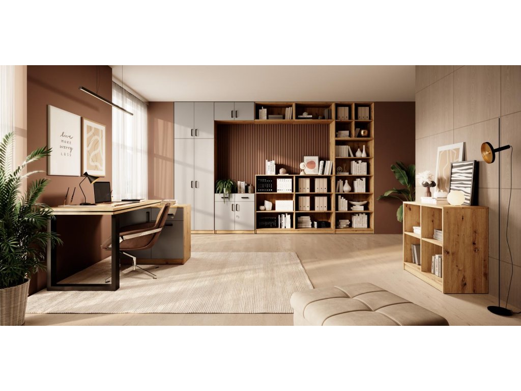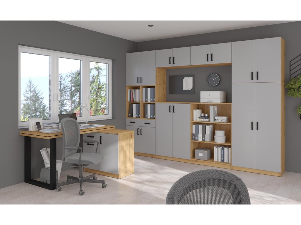 Světle šedá barva v kombinaci s dekorem dub artisan vytváří svěží a vzdušný vzhled vhodný do kanceláře i domácí pracovny. Jednoduchý design ladí s různými styly interiéru.