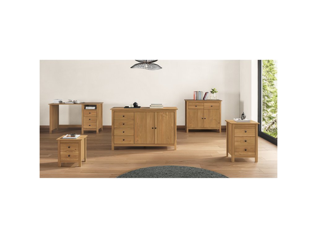 Stůl je vyroben z voskované borovice v medovém odstínu, který zajišťuje příjemný přírodní vzhled a odolnost. Vhodný pro domácí i kancelářské použití.